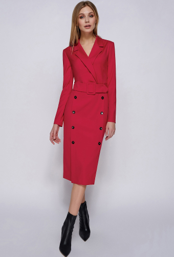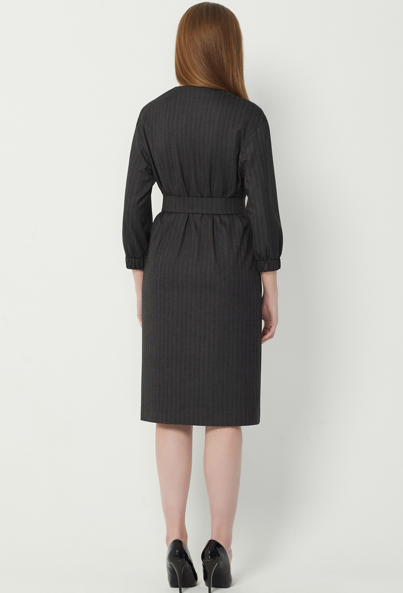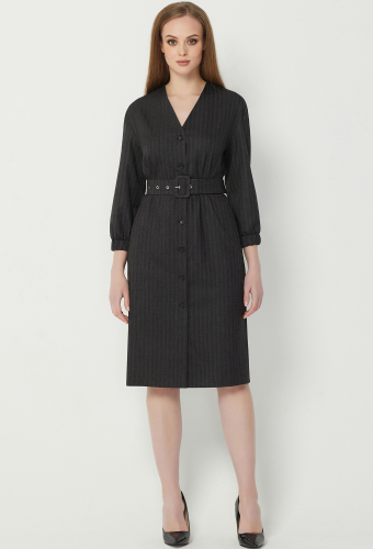 Платье прямого, со спущенной линией плеча. Перед с однобортной застежкой на петли и пуговицы, V-образным вырезом горловины и двумя нагрудными вытачками. Рукава одношовные, по нижнему срезу собраны на резинку. Боковые швы с функциональными карманами. Дополняется поясом с пряжкой из основной ткани.