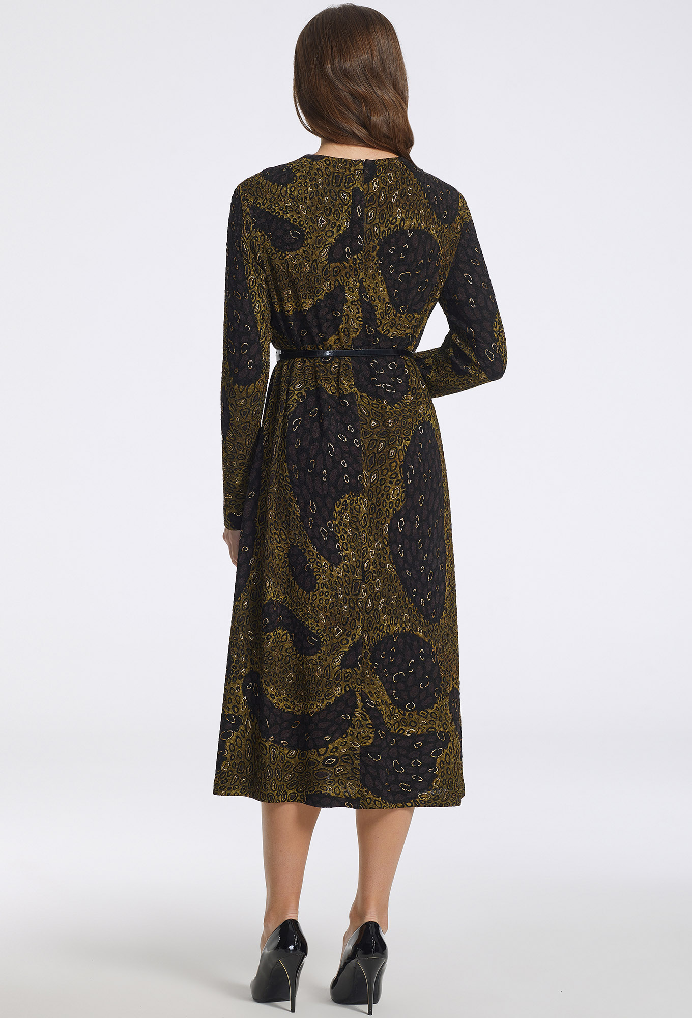 Платье А-образного силуэта с округлой формой горловины, рукава втачные одношовные, среднем шве спинки обработано потайная молния. Платье дополняется поясом ремнем.