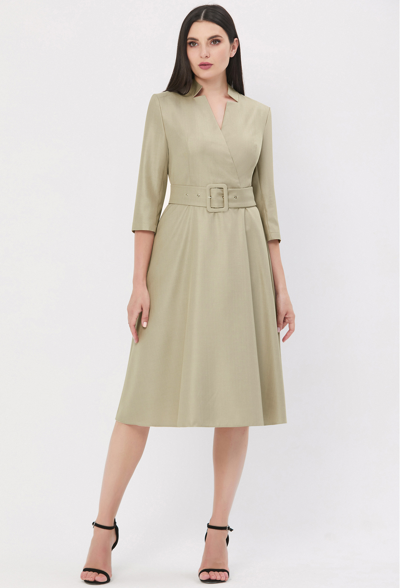 Платье-миди Х-образного силуэта, отрезное по линии талии. Верхняя часть переда с эффектом запаха и фигурной формой борта. Рукава втачные двушовные. Воротник – стойка. Дополняется поясом с пряжкой из основной ткани.