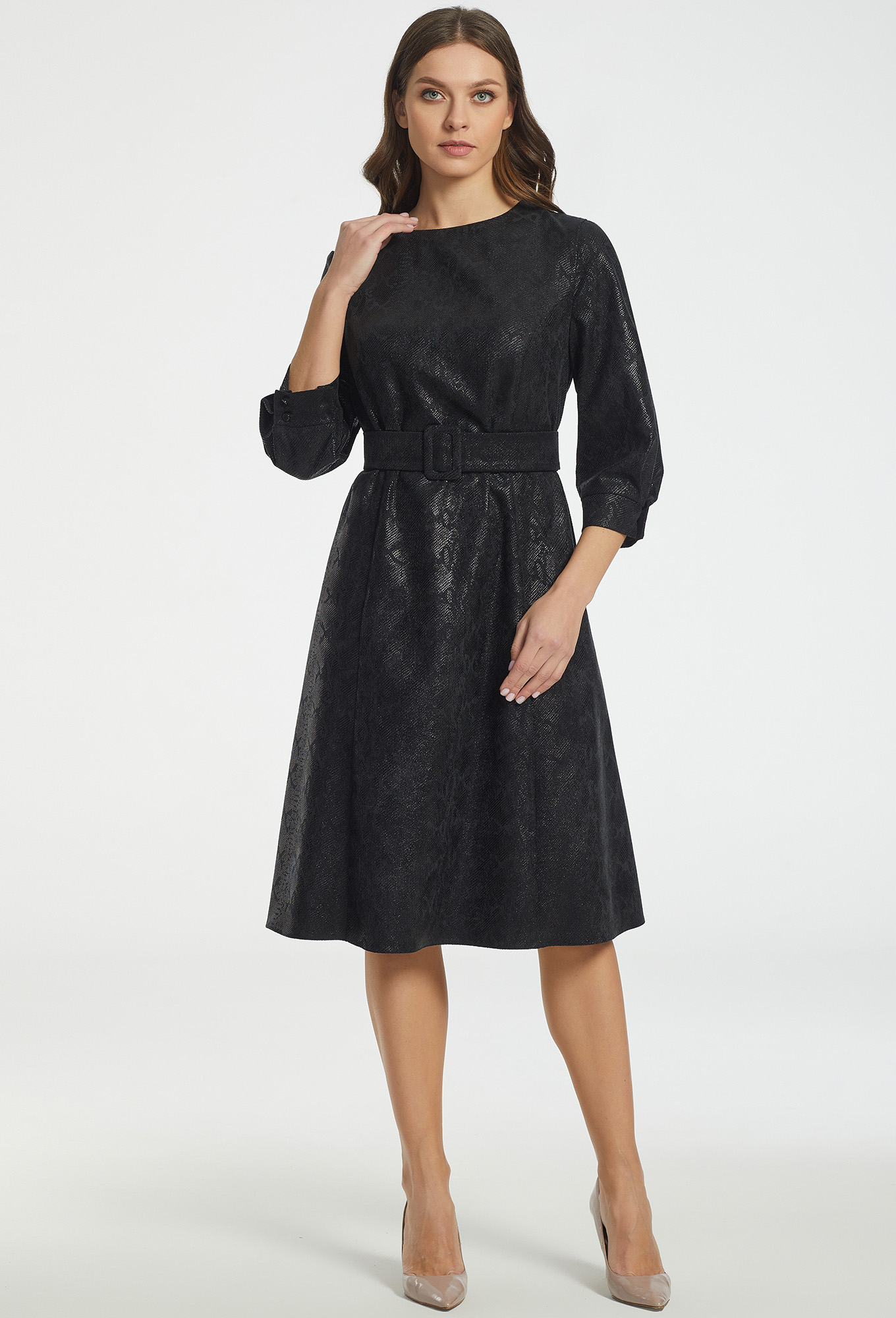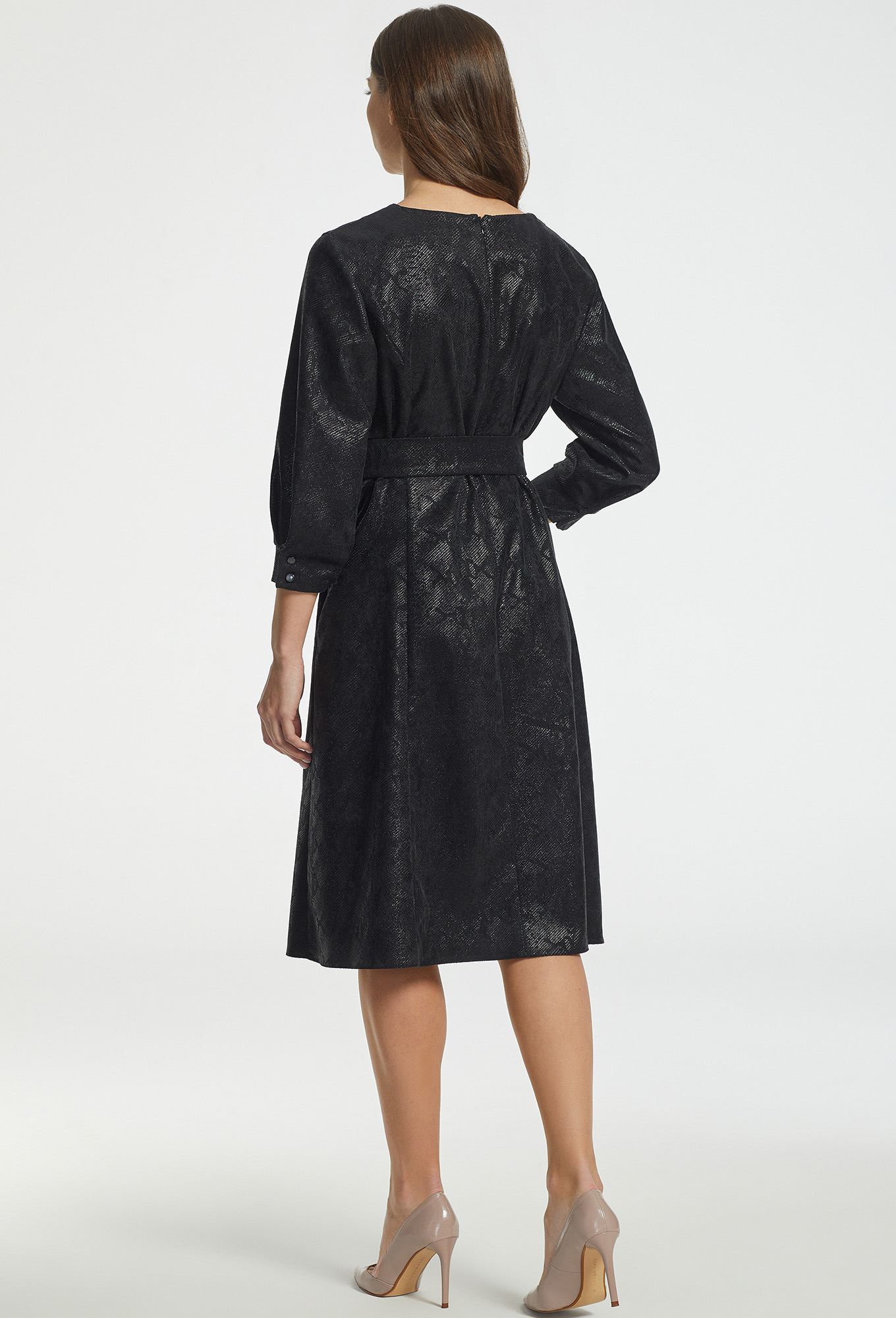 Элегантное платье Х-образного силуэта выполнено из красивой ткани. Романтичность платью придают интересного кроя укороченные рукава со складками и притачными манжетами с декоративными пуговицами. В среднем шве спинки обработана потайная молния, а в боковых швах функциональные карманы. Чтобы сделать модель еще более эффектной, линию талии подчеркнули широким поясом с пряжкой из основной ткани.