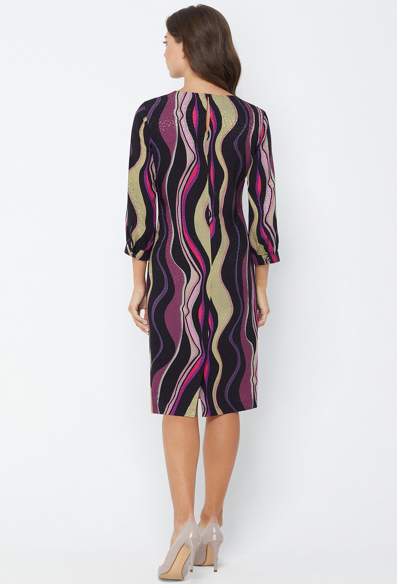 Безупречное в своей простоте платье с округлой формой горловины выполнили из вискозной ткани интересной фактуры с характерным мерцающим блеском и ярким контрастным волнообразным принтом. Модель прямого силуэта, в среднем шве спинки обработаны застёжка на навесную петлю и пуговицу и шлица. Рукава втачные одношовные укороченные, со сборкой по низу и с притачными манжетами с декоративными пуговицами.