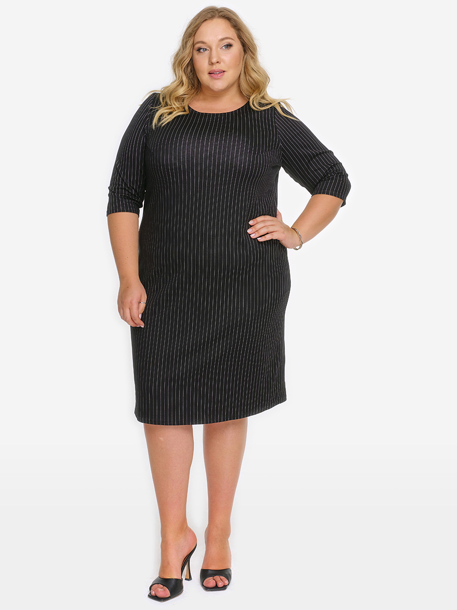 Платье базовое полуприлегающего силуэта из мягкого черного джерси в вертикальную полосочку .  Комфортное, за счет мягкости ткани и отработанной конструкции. Рукав 3/4. Вырез горловину округлый.