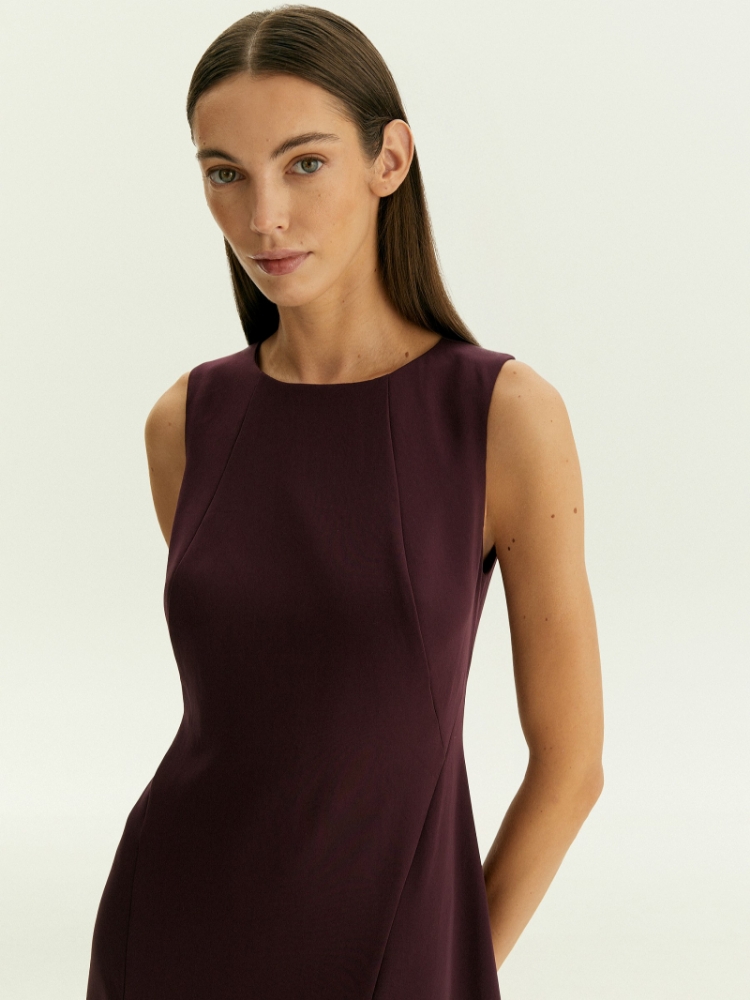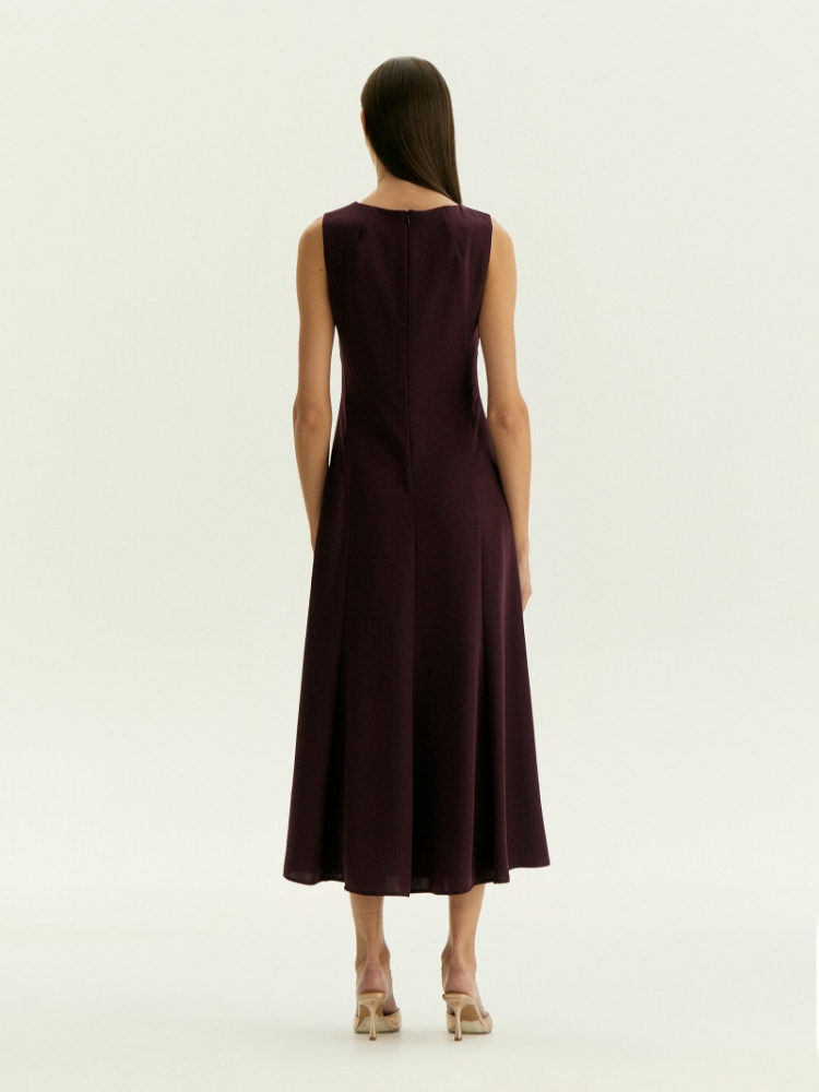 Платье мидакси без рукавов подойдёт на каждый день и к особым случаям. Отличный вариант для образов с тонкими лонгсливами из сетки или жакетами. Рельефы визуально сужают области бёдер и плеч, а в нижней части платья также создают более динамичную конструкцию платья, которая эффектно раскрывается в движении. Цвет инжира — среди ключевых в новом сезоне; он делает образ актуальным, дорого и благородно выглядит, органично вписывается в деловой дресс-код. Платье выполнено без подкладки