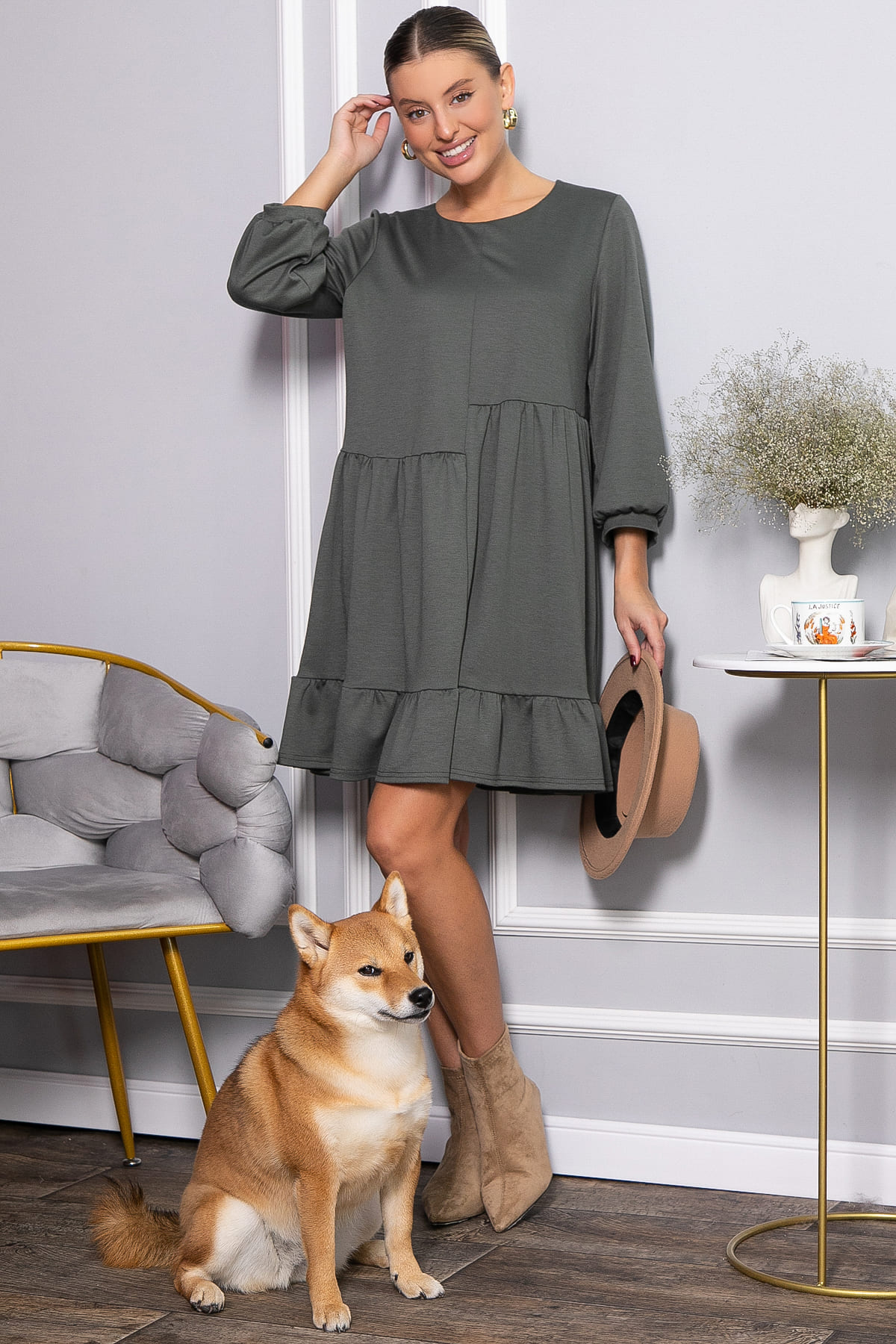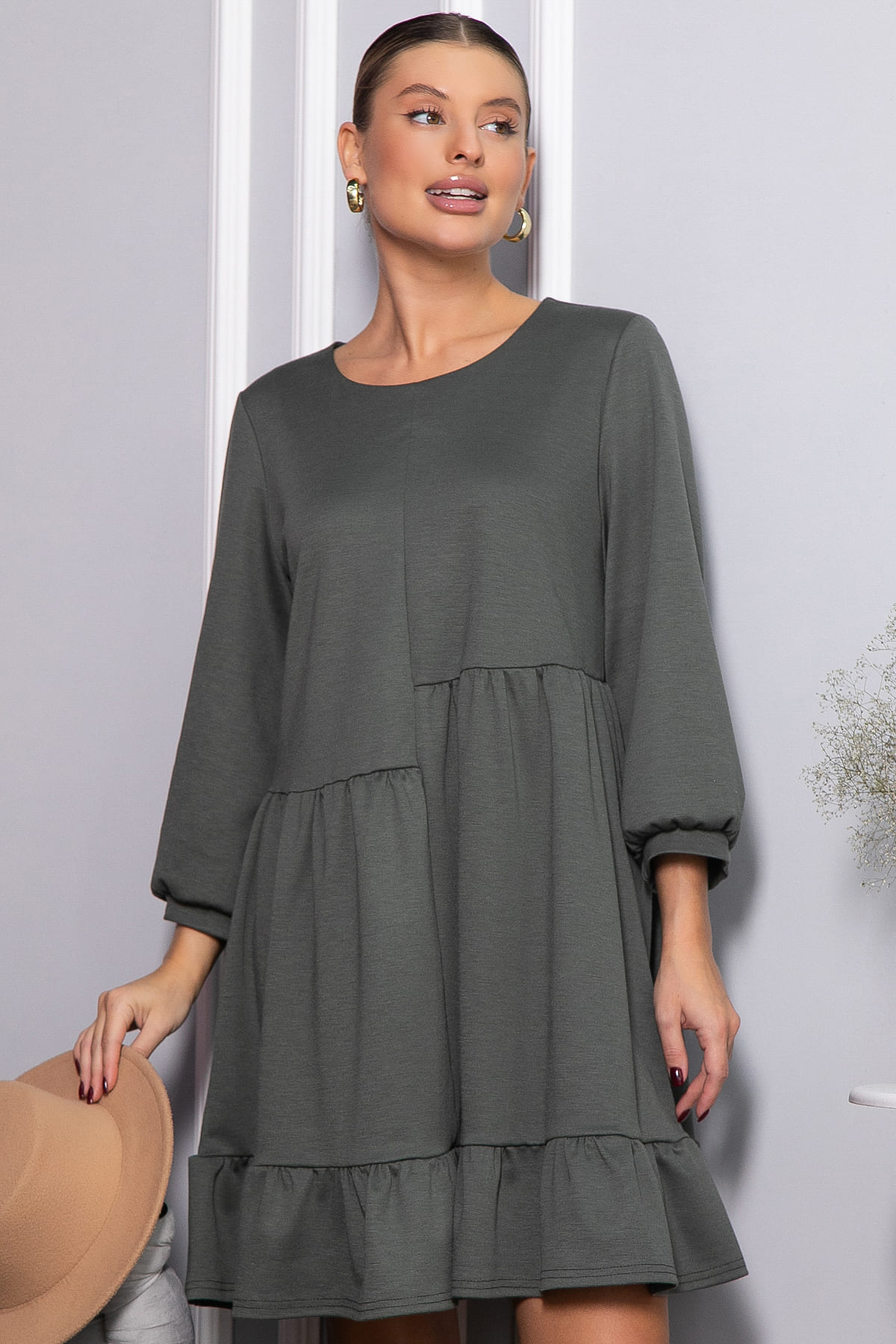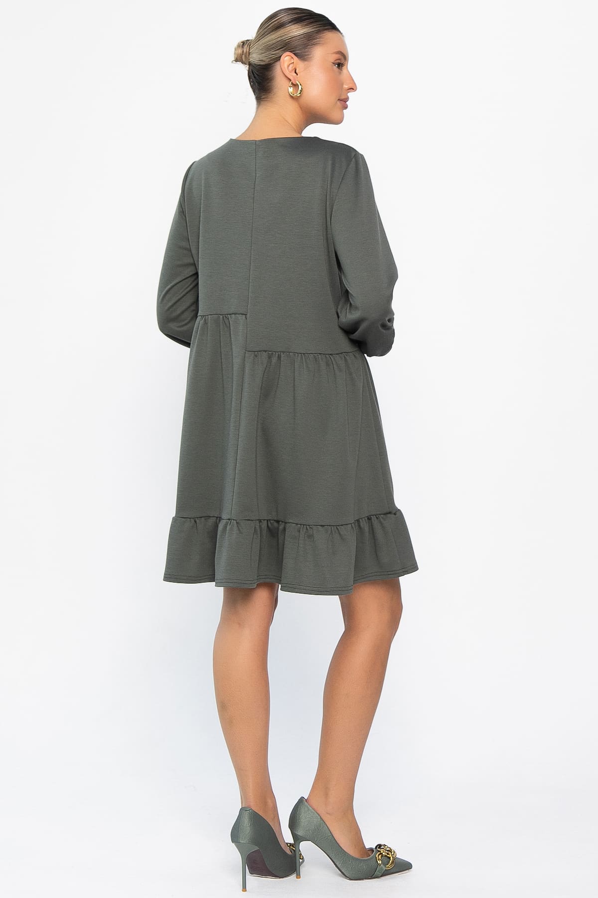 Платье бохо А-силуэта в темно-оливковом цвете — универсальная вещь на любой случай. Вне зависимости от фигуры, оно выглядит одинаково хорошо. По переду и спинке есть ассиметрия. Рукава длиной 7/8 собраны по низу на мягкий манжет. Округлый вырез горловины добавляет женственности. Платье выполнено из трикотажного полотна «Милано» — это мягкий, эластичный и приятный к телу материал. Прекрасный выбор на прохладную погоду.