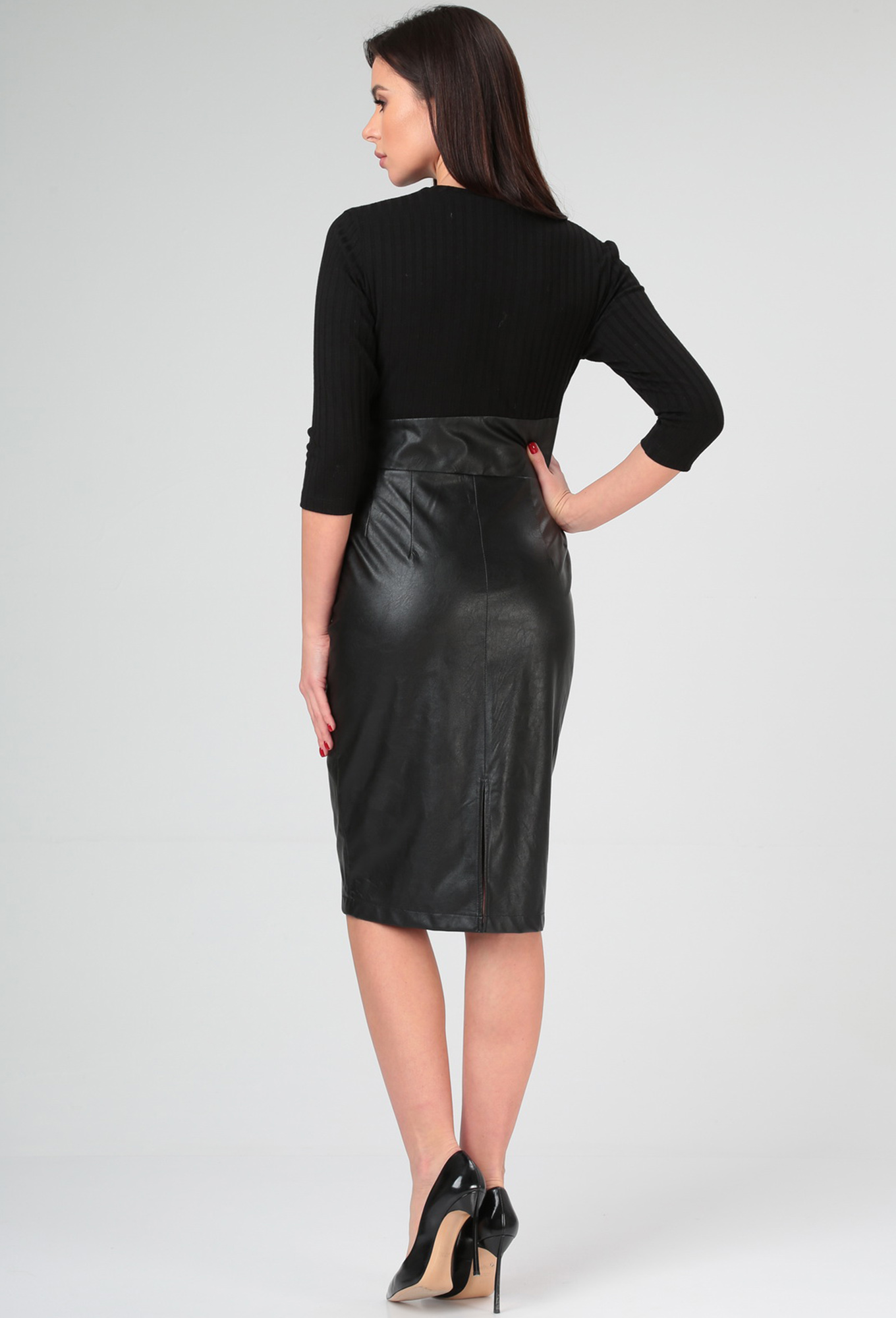 Платье женское полуприлегающего из двух видов тканей. Лиф платья из трикотажного полотна, рукав втачной одношовный длиной 3/4,горловина округлой формы обработана трикотажной бейкой. Нижняя часть платья из эко-кожи. Перед со средним швом и боковыми карманами. Спинка со средним швом с разрезом внизу, в области талии по две вытачки. Притачной пояс на спинке и отлетной по переду фиксируется пряжкой. По поясу, карманам , разрезу и среднему шву отделочная строчка 0,5 см.