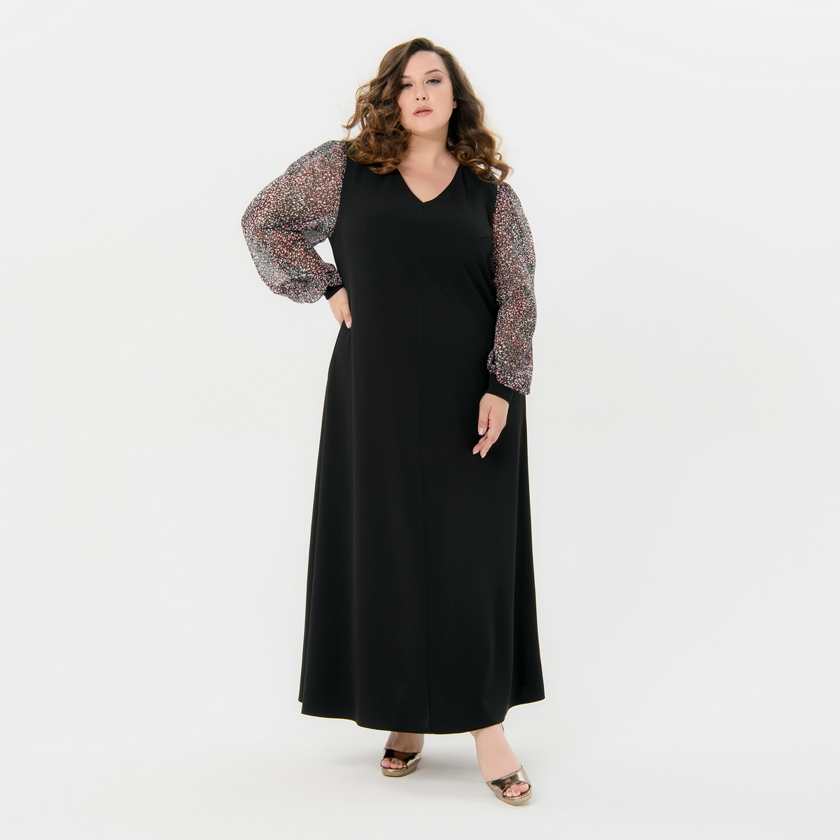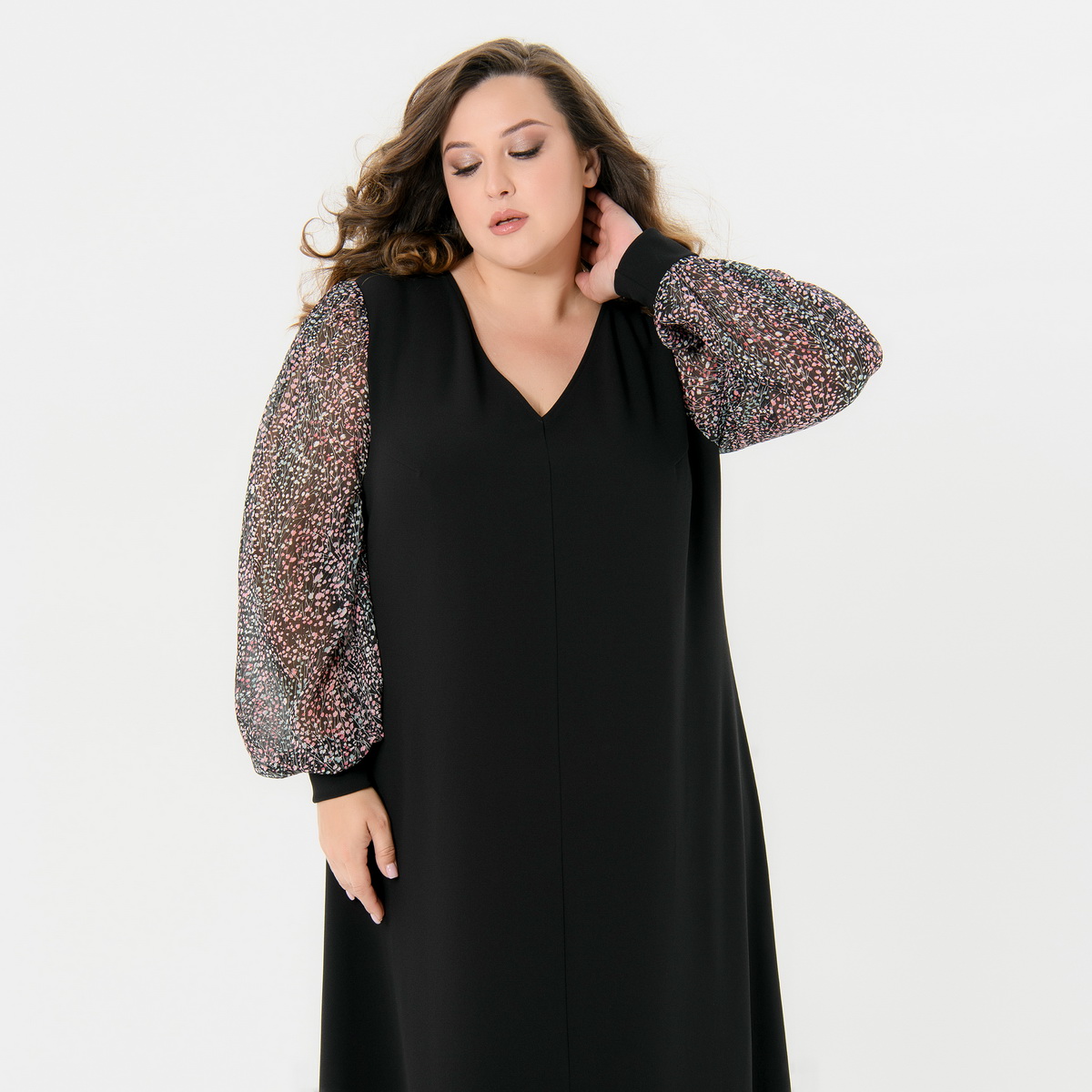 Романтичное длинное платье А-силуэта из крепа с эластаном. По горловине переда V-вырез. Длинный рукав "фонарик" из нежного черного шифона "крэш" с растительным принтом позволяет скрыть полноту рук. По низу рукава легкая сборка, манжет из основной ткани.