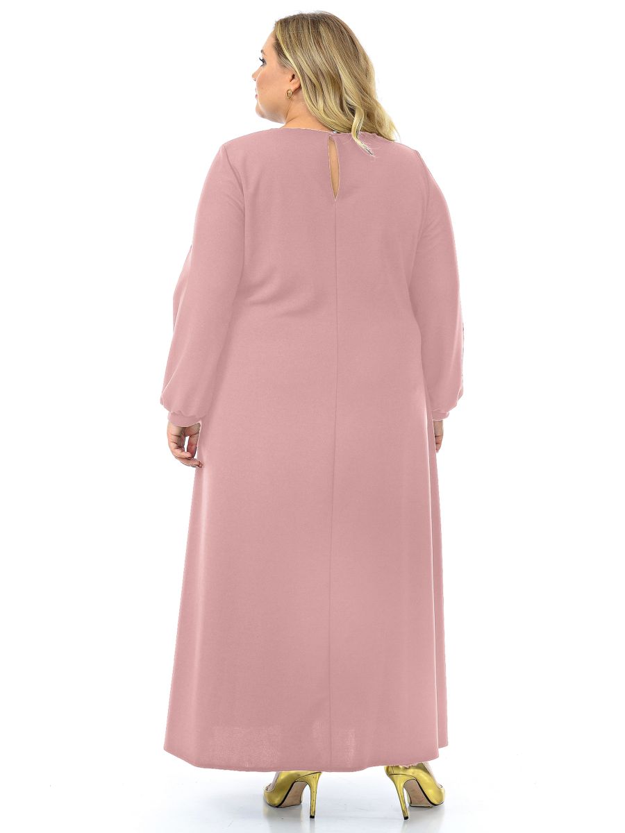 Длинное платье А-силуэта из крепа с эластаном. Вырез горловины округлый. По центру горловины спинки вырез "капля", застегивающийся на хрустальную пуговицу. Рукав длинный, по низу легкая сборка, на манжете.