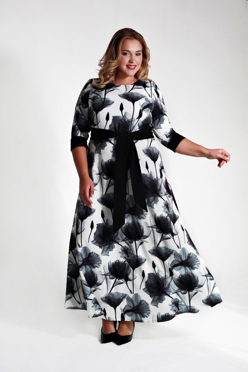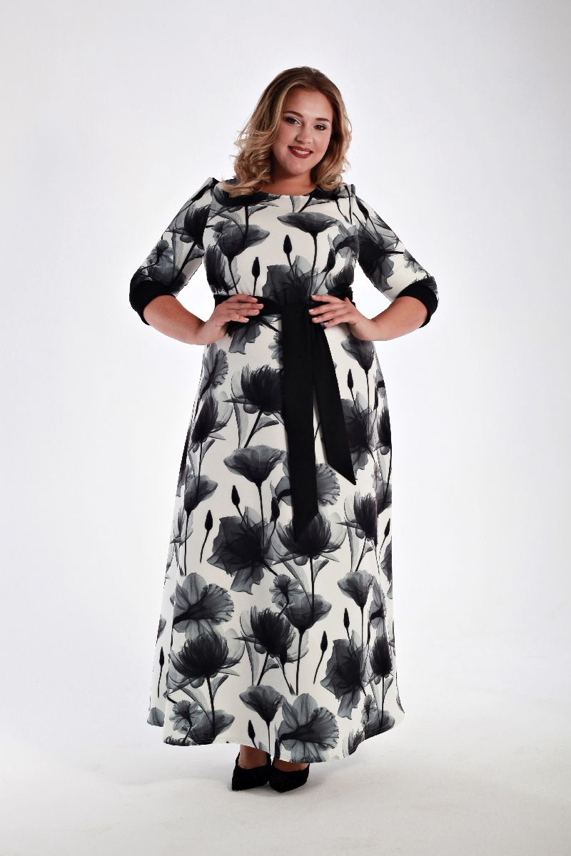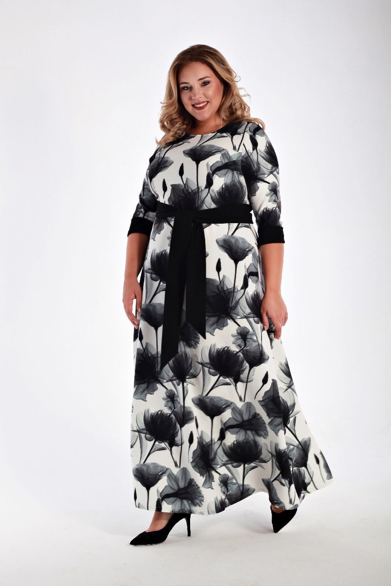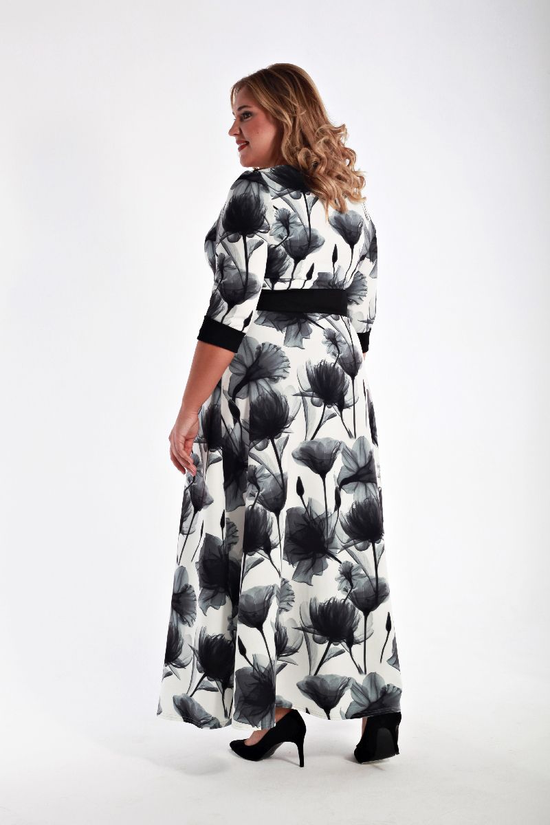 Романтичное длинное платье из крепа с эластаном. Принт - серо-черные цветы на белом фоне. Отрезное по линии талии, юбка расклешенная, манжеты и пояс черного цвета. Пояс в комплекте.