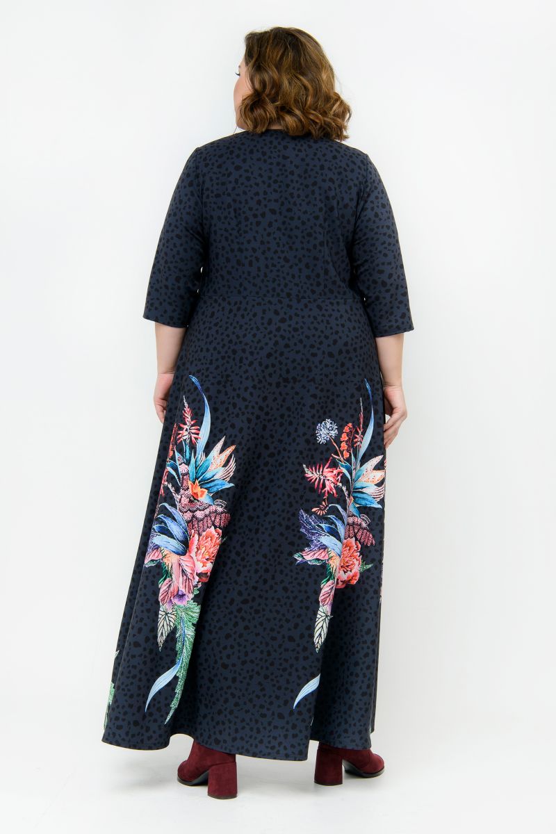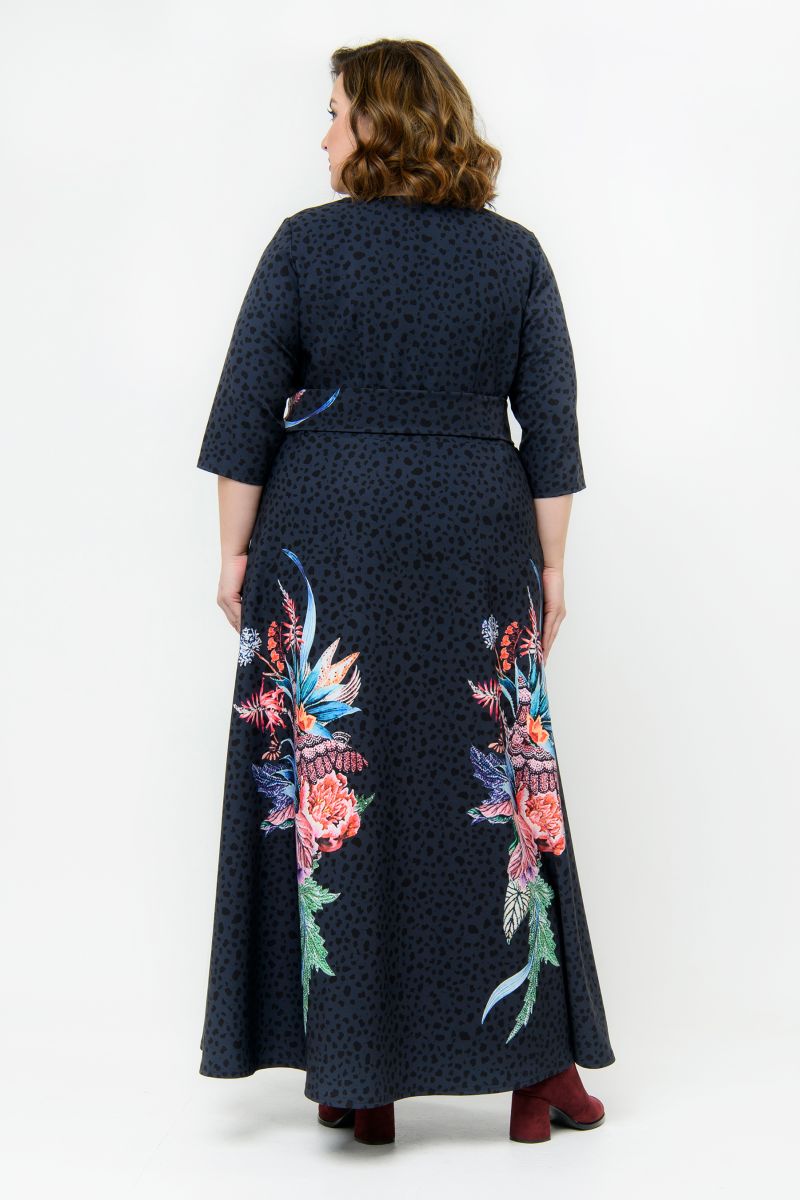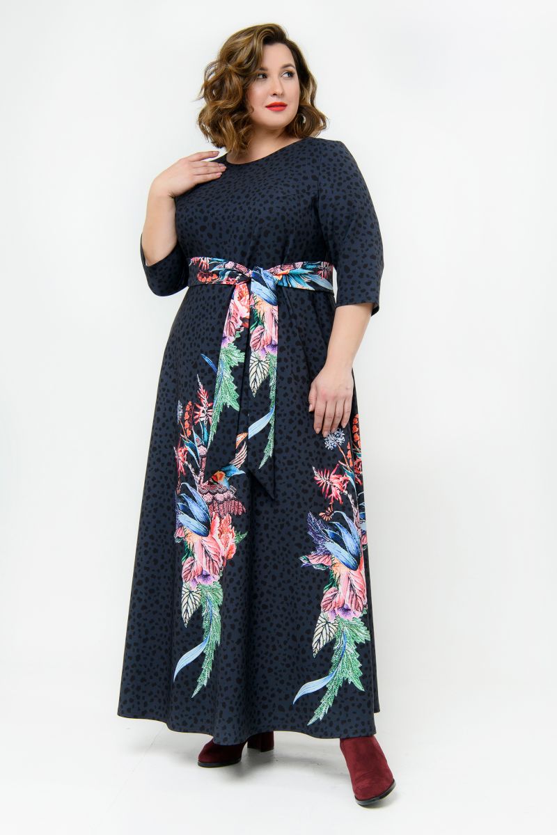 Платье длинное из крепа, принт яркий на темном