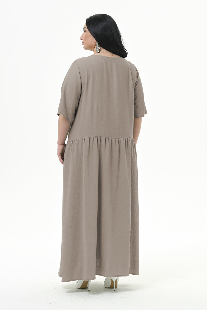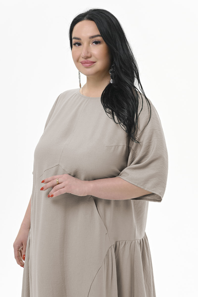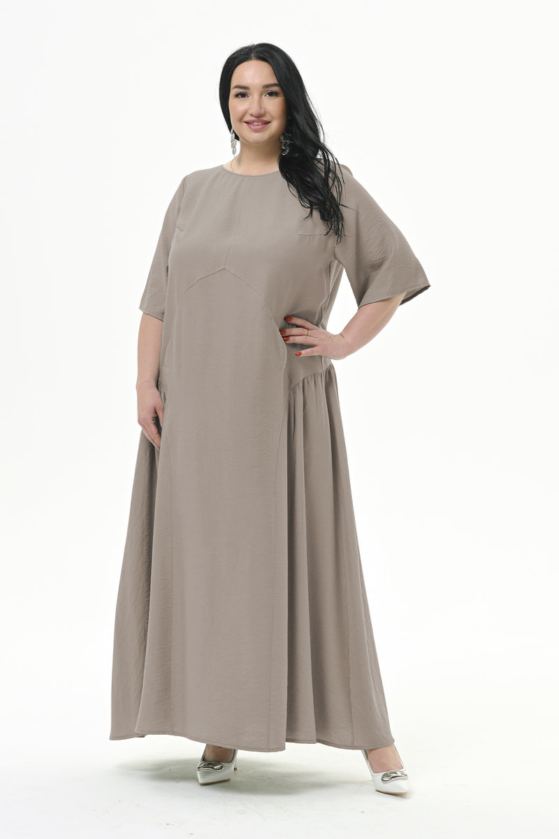 Платье длинное, свободного силуэта, из плотной плательной ткани. Нижняя часть платья отрезная, присборенная. Линия подреза по переду фигурная, по спинке горизонтальная. В швах подрезов обработаны карманы. Рукав втачной, свободный.