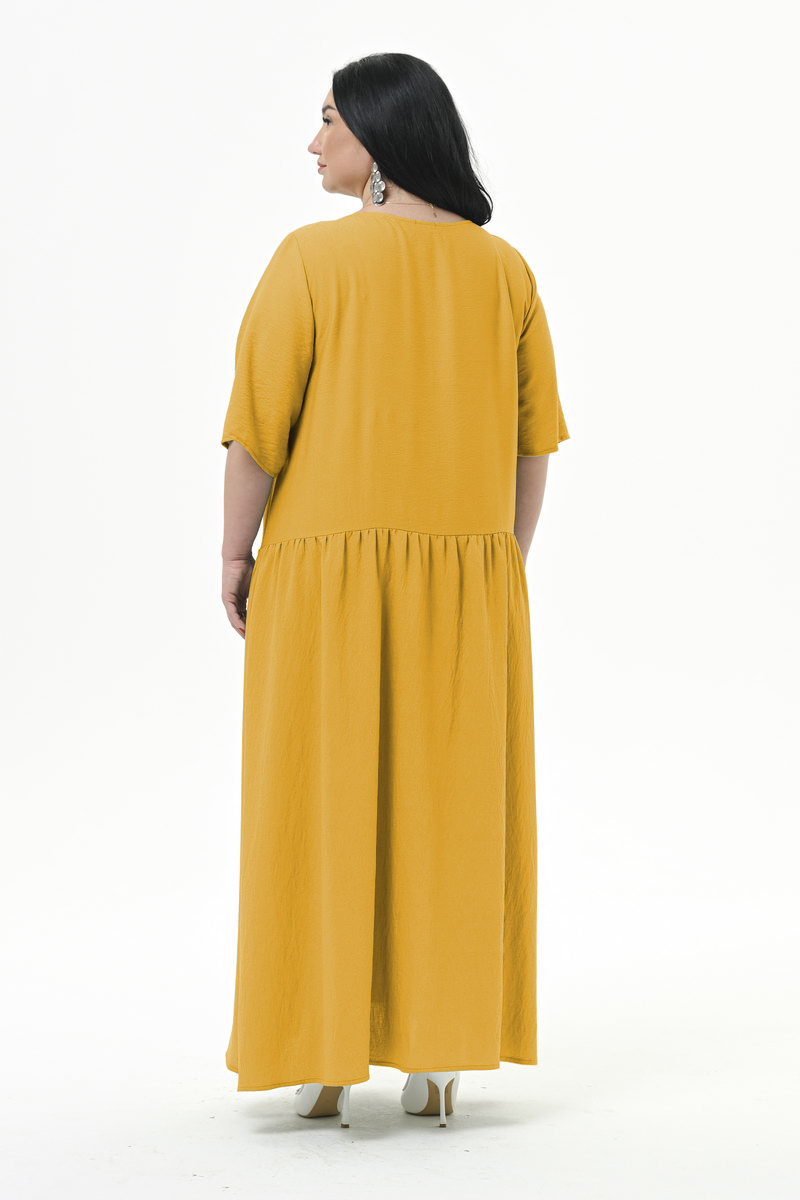 Платье длинное, свободного силуэта, из плотной плательной ткани. Нижняя часть платья отрезная, присборенная. Линия подреза по переду фигурная, по спинке горизонтальная. В швах подрезов обработаны карманы. Рукав втачной, свободный.