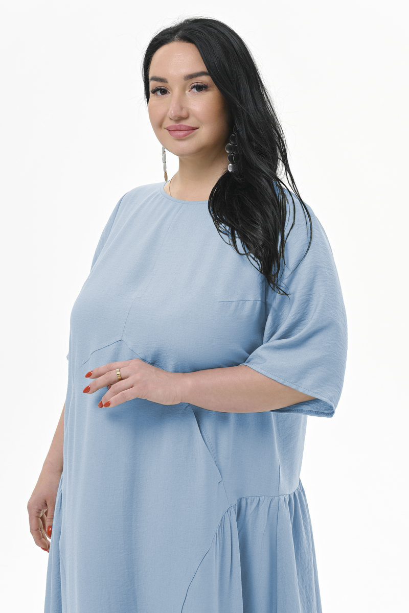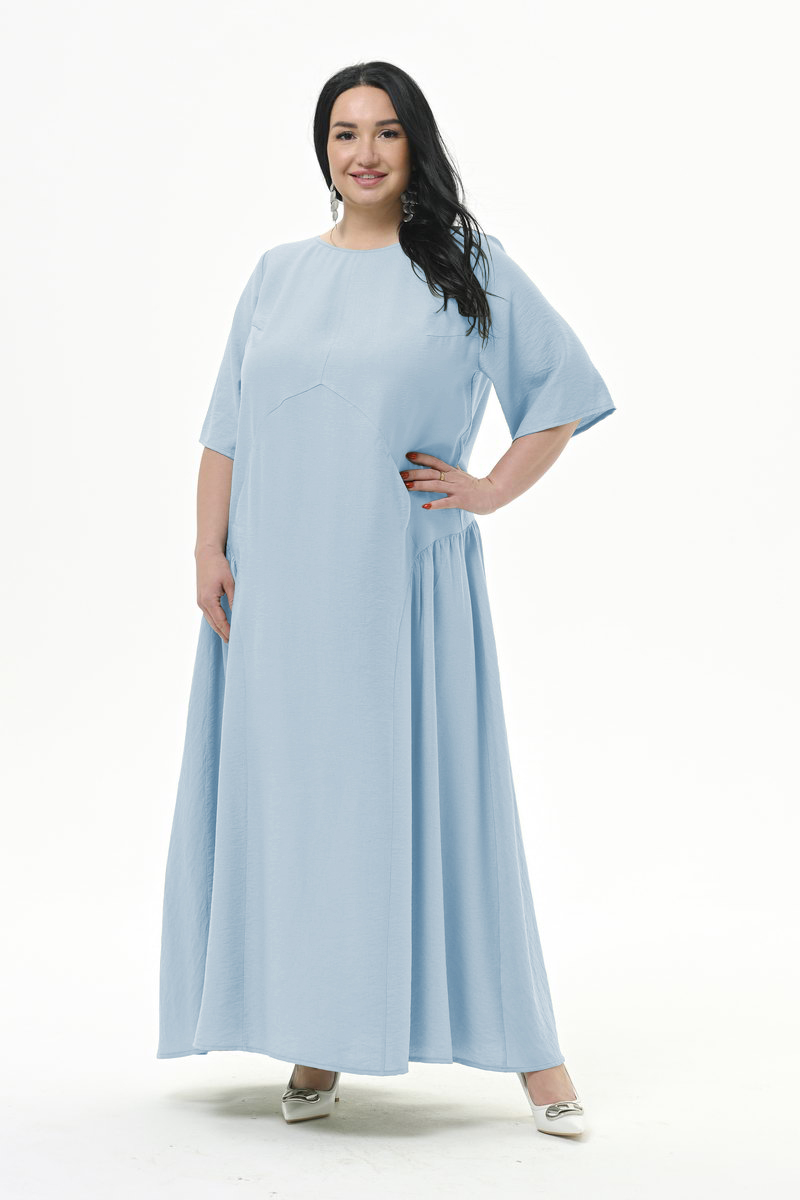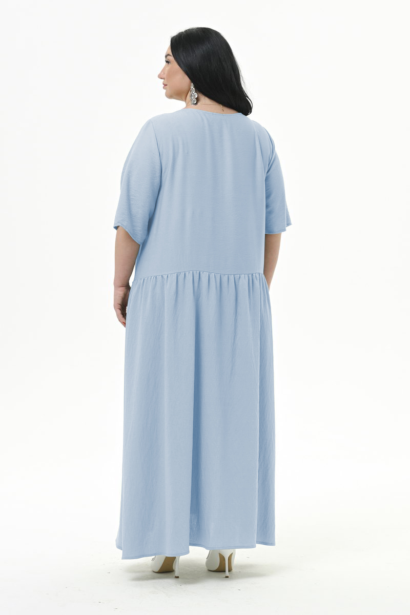 Платье длинное, свободного силуэта, из плотной плательной ткани. Нижняя часть платья отрезная, присборенная. Линия подреза по переду фигурная, по спинке горизонтальная. В швах подрезов обработаны карманы. Рукав втачной, свободный.