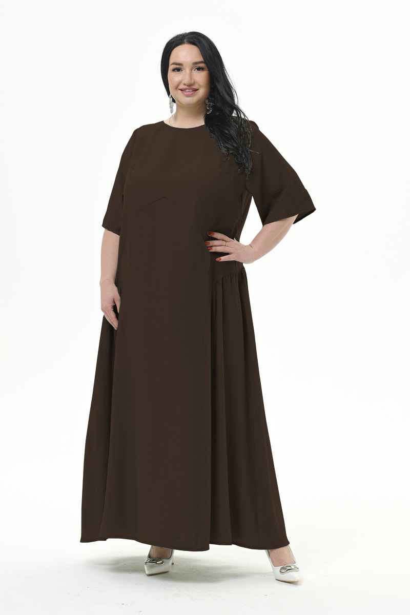 Платье длинное, свободного силуэта, из плотной плательной ткани. Нижняя часть платья отрезная, присборенная. Линия подреза по переду фигурная, по спинке горизонтальная. В швах подрезов обработаны карманы. Рукав втачной, свободный.