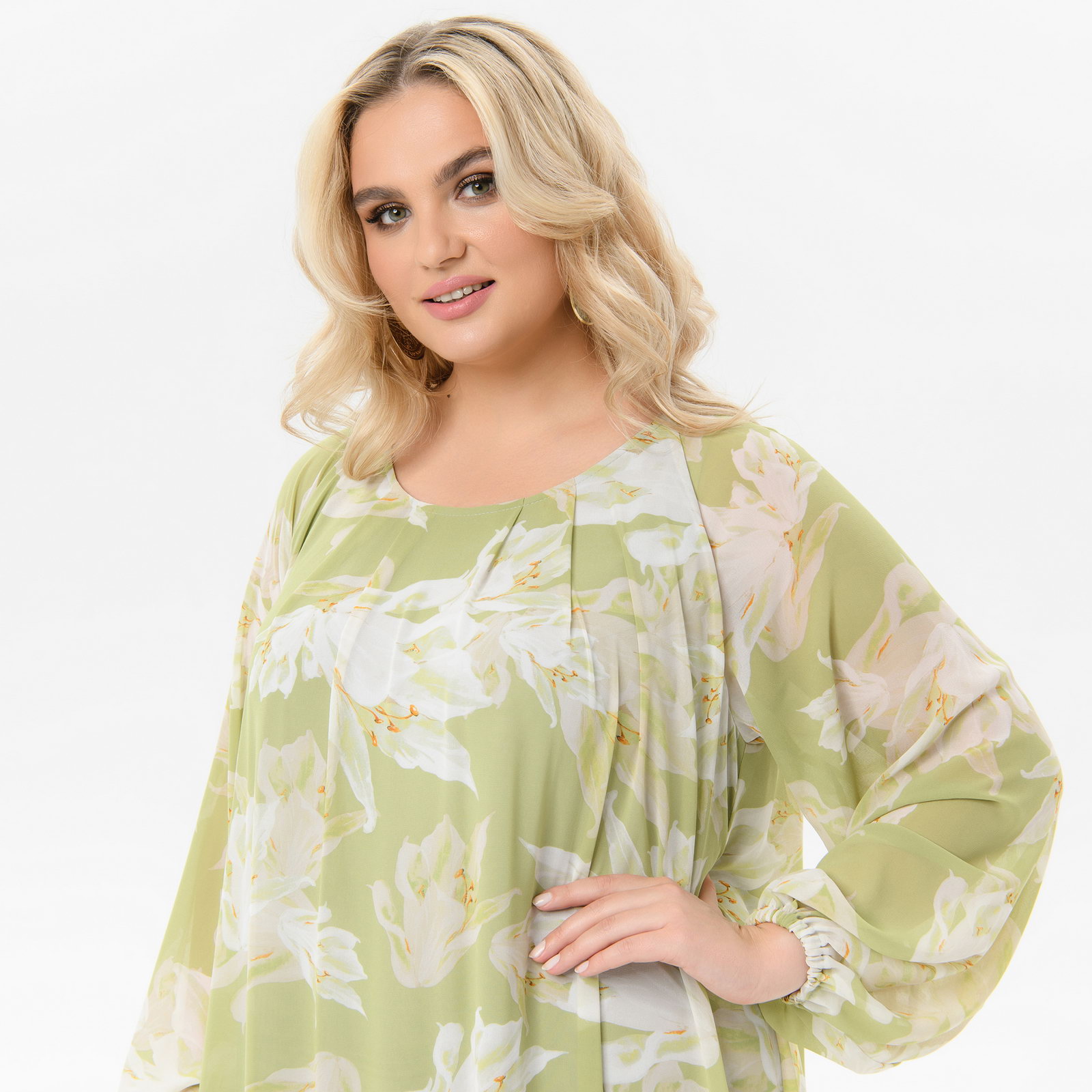 Длинное струящееся платье с рукавом реглан. Модель выполнена из шифона, на подкладке из эластичного трикотажа. Горловина округлая с мягкими складками по переду, по спинке вырез "капелька", застегивающийся на пуговицу.