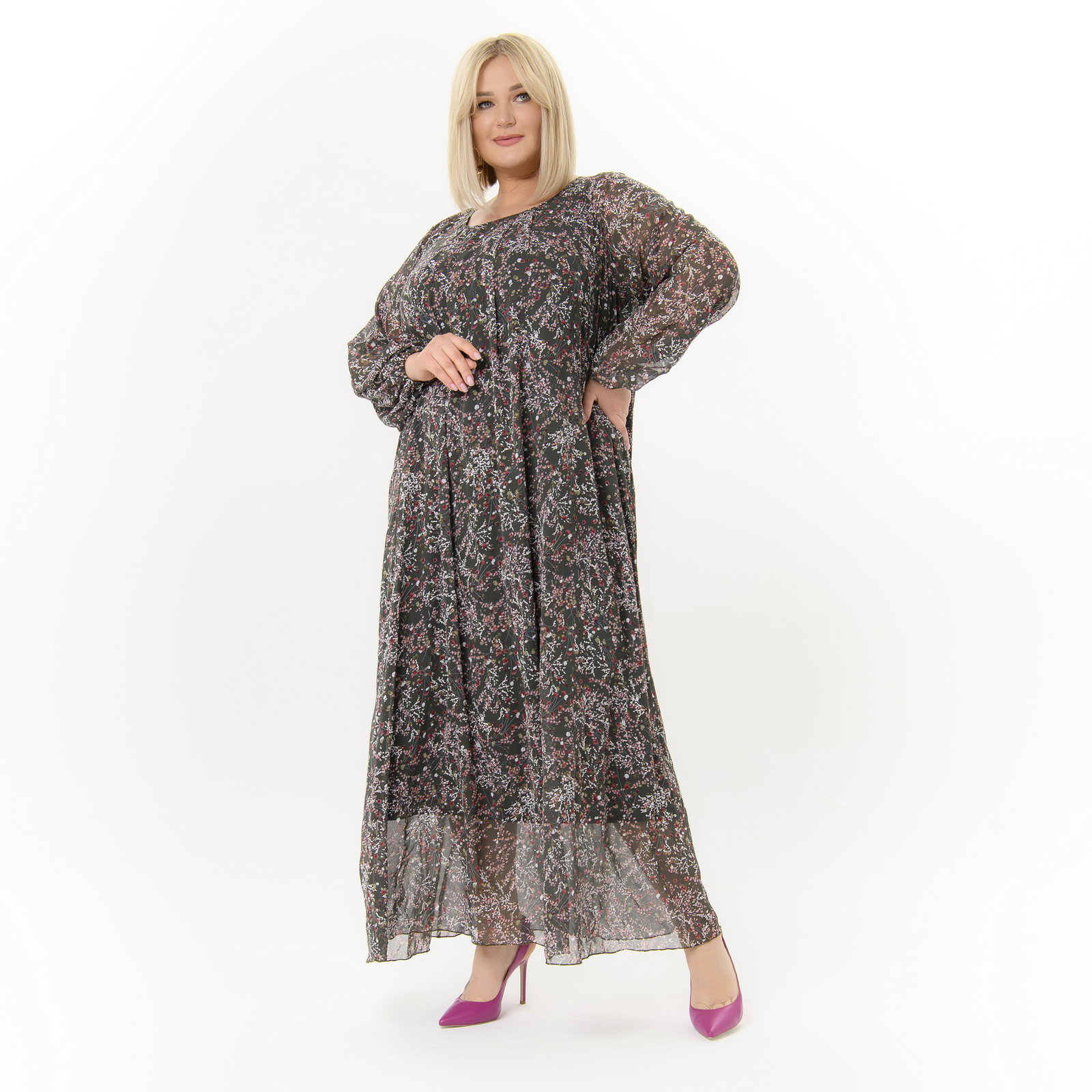 Платье длинное из шифона, принт "травяной"