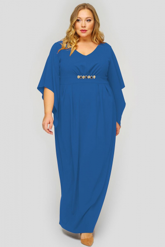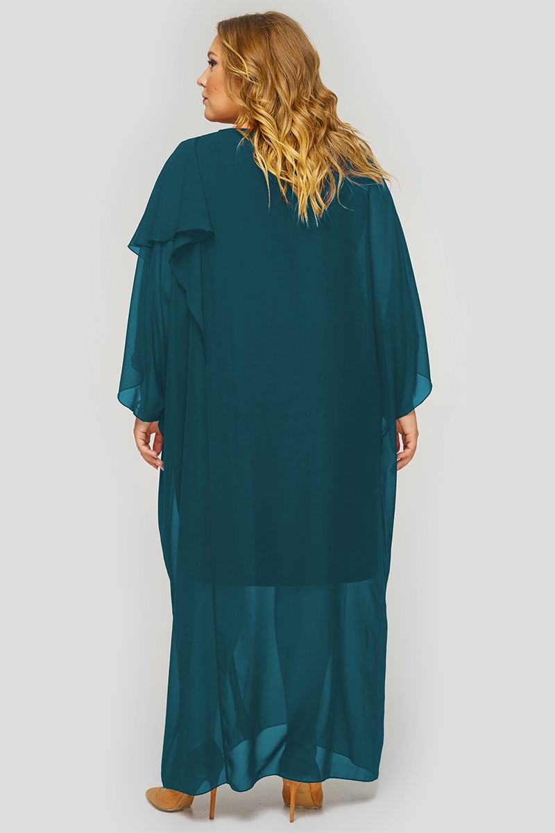Длинное платье из шифона на подкладке. По левому рельефу втачано "крылышко", которое переходит с переда на спинку. По переду пришивное украшение со стразами. По низу левого рельефа - разрез. Вырез горловины круглый.