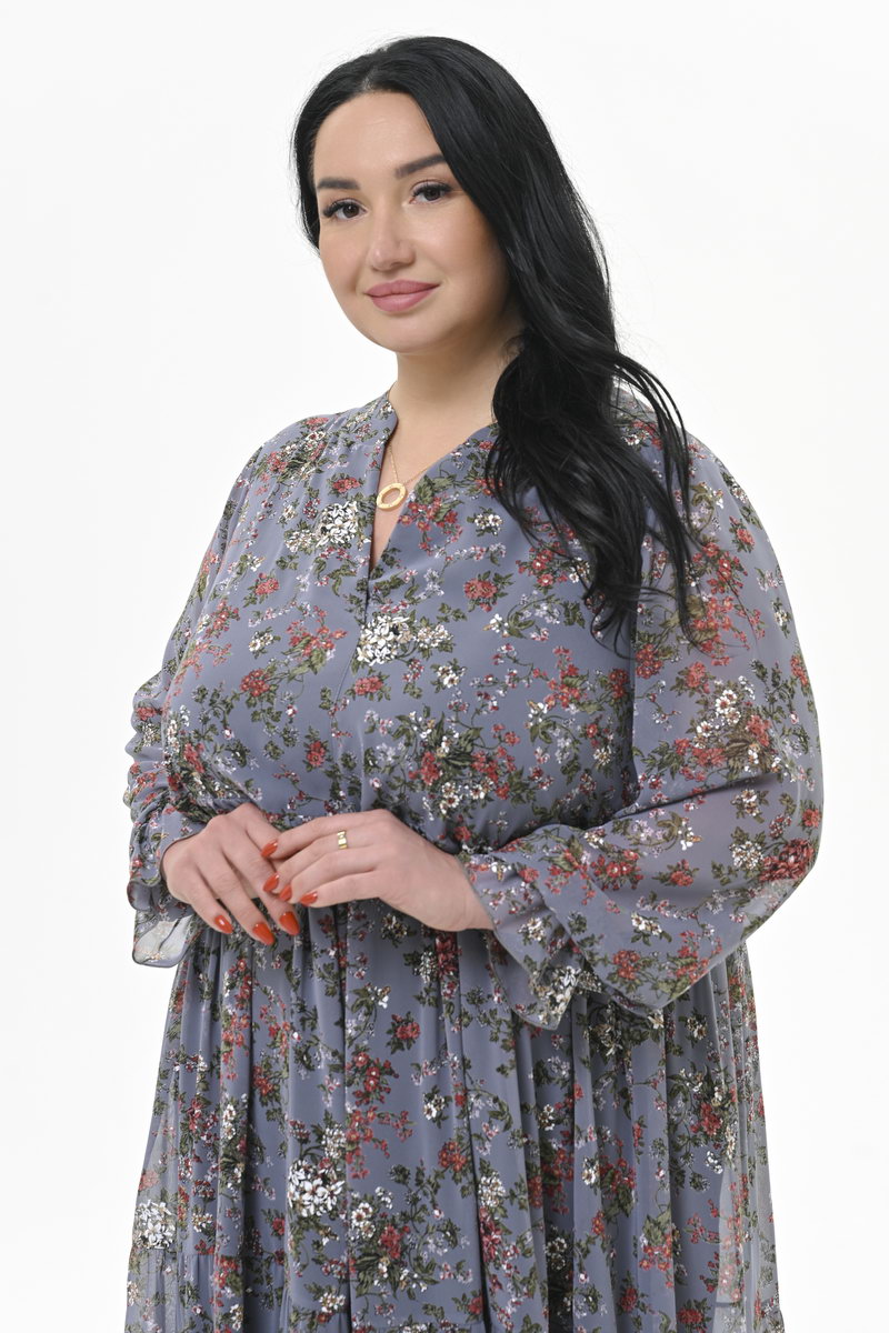 По горловине платья планочка, образующая V-вырез, и плосколежащая стоечка. Рукав втачной, свободный, на резиночке по низу,