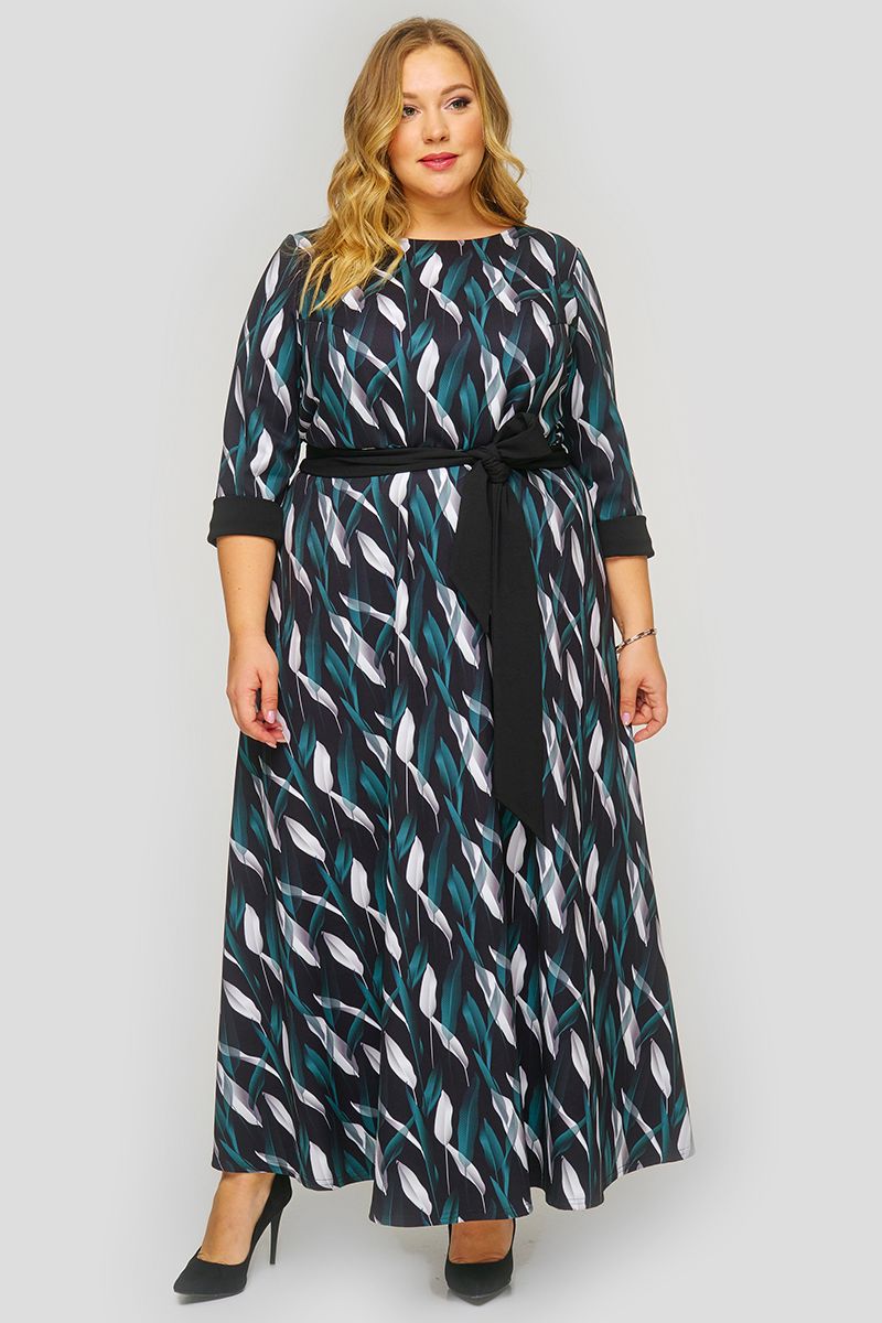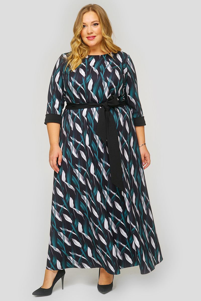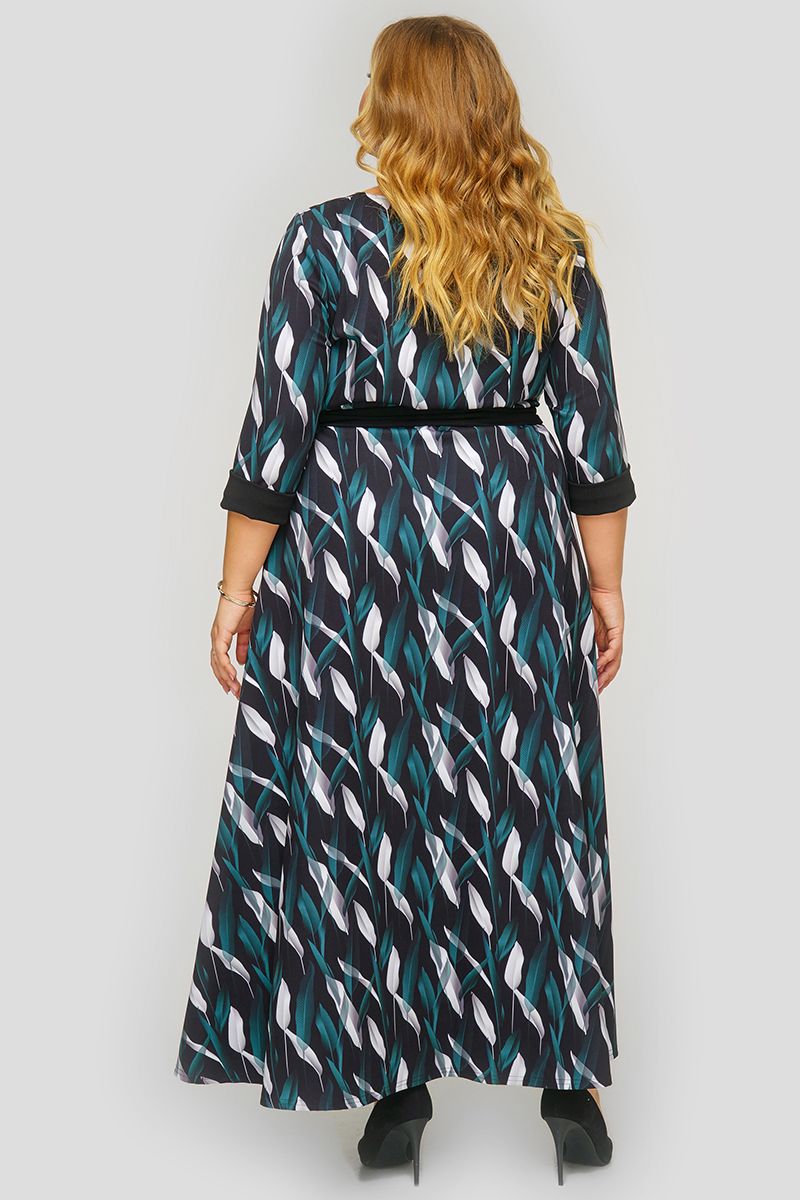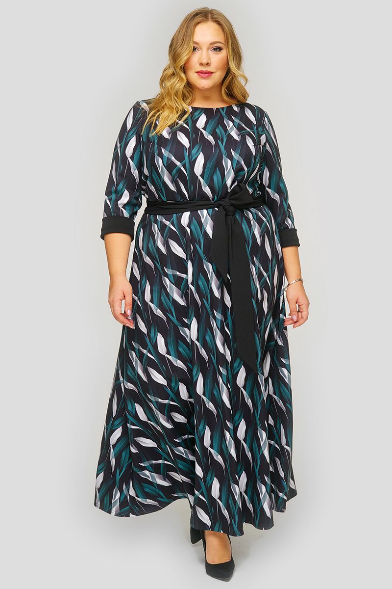 Длинное платье из крепа, принт "листья". Отрезное по линии талии, юбка расклешенная. Вырез горловины круглый. Рукав 3/4.