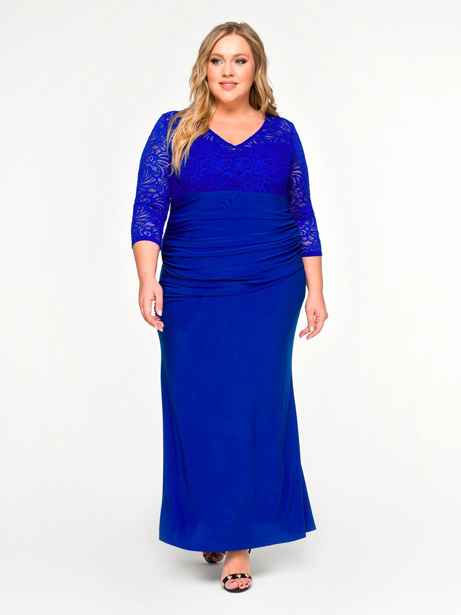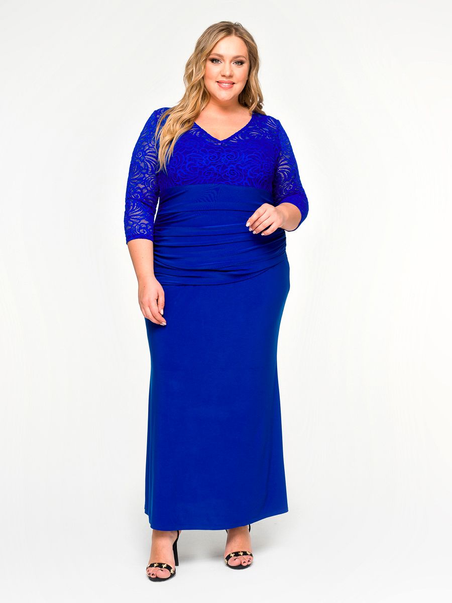 Романтичное вечернее длинное платье из трикотажа. Верхняя часть из кружева, отрезная. По переду юбки, под областью живота подрез, отрезная деталь декорирована драппировкой, которая скрадывает нежелательные нюансы этой части фигуры. Рукав 3/4 из кружева. Платье на подкладке.