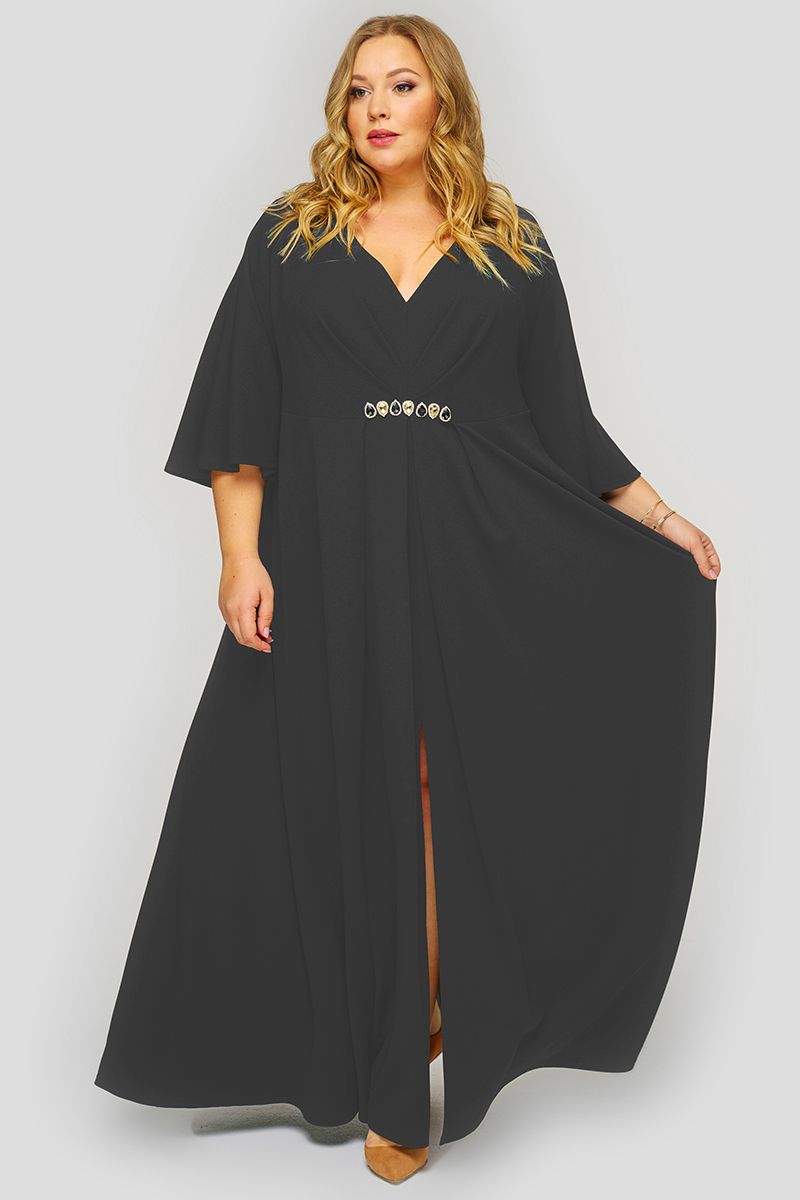 Платье длинное с разрезом из черного крепа с пришивным украшением