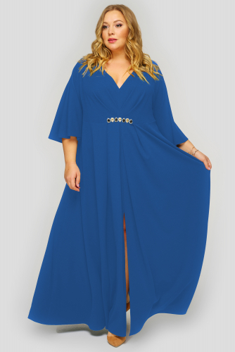 Платье длинное с разрезом из василькового крепа с пришивным украшением *