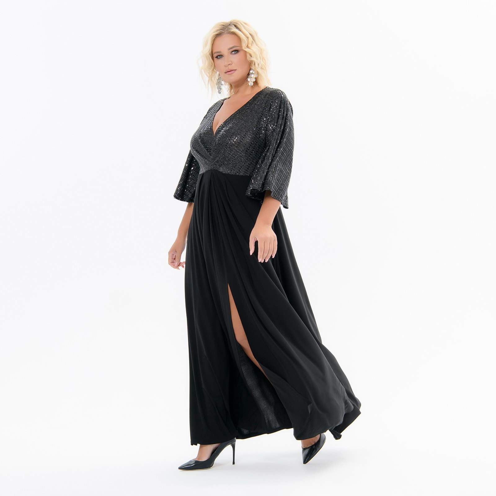 Платье длинное с разрезом, верхняя часть с блеском