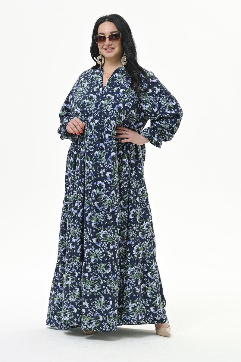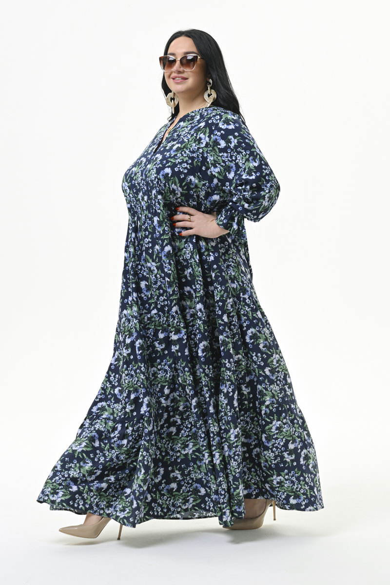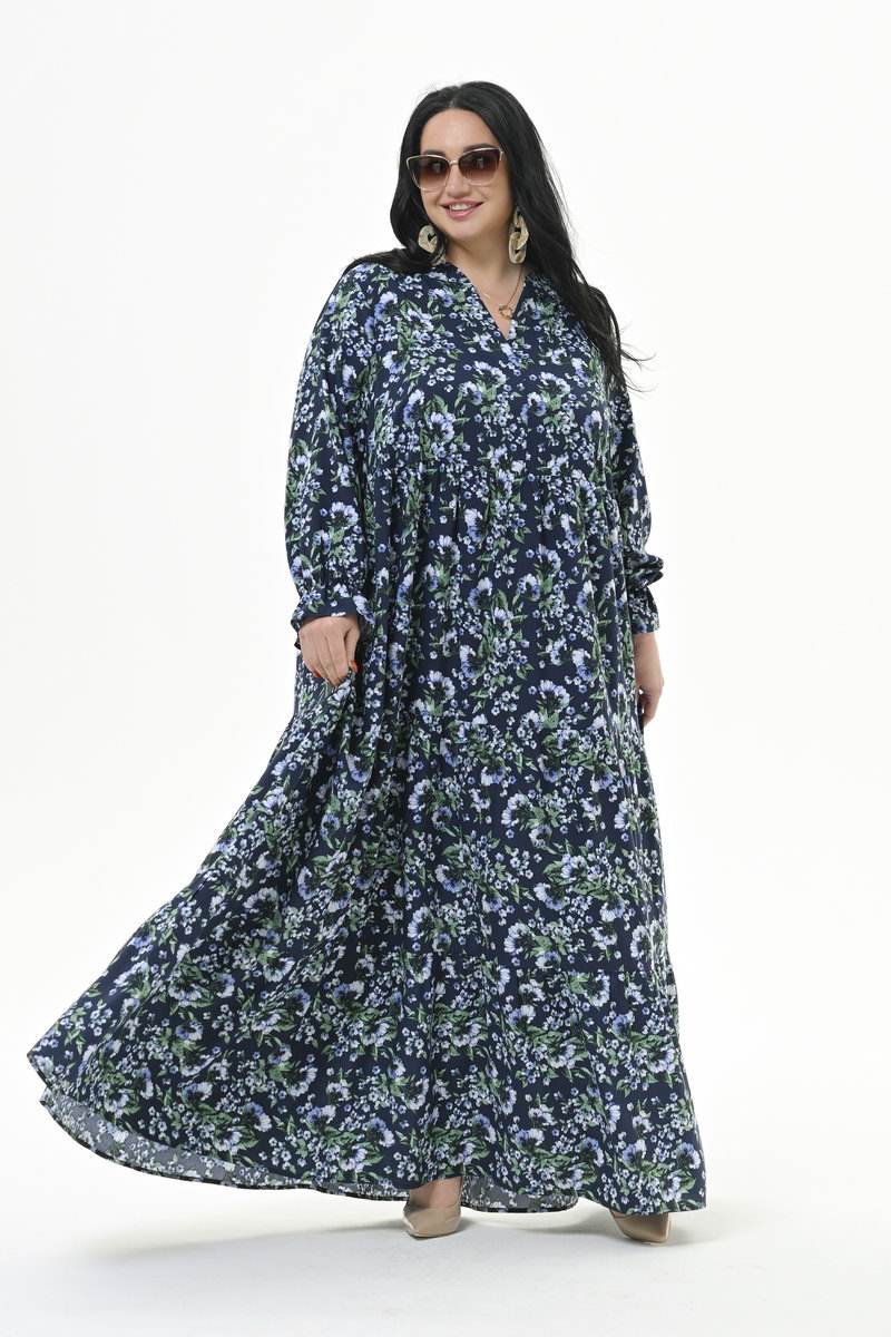 Платье длинное, с тунисским вырезом, каскадное, темно-синее, принт цветочный *