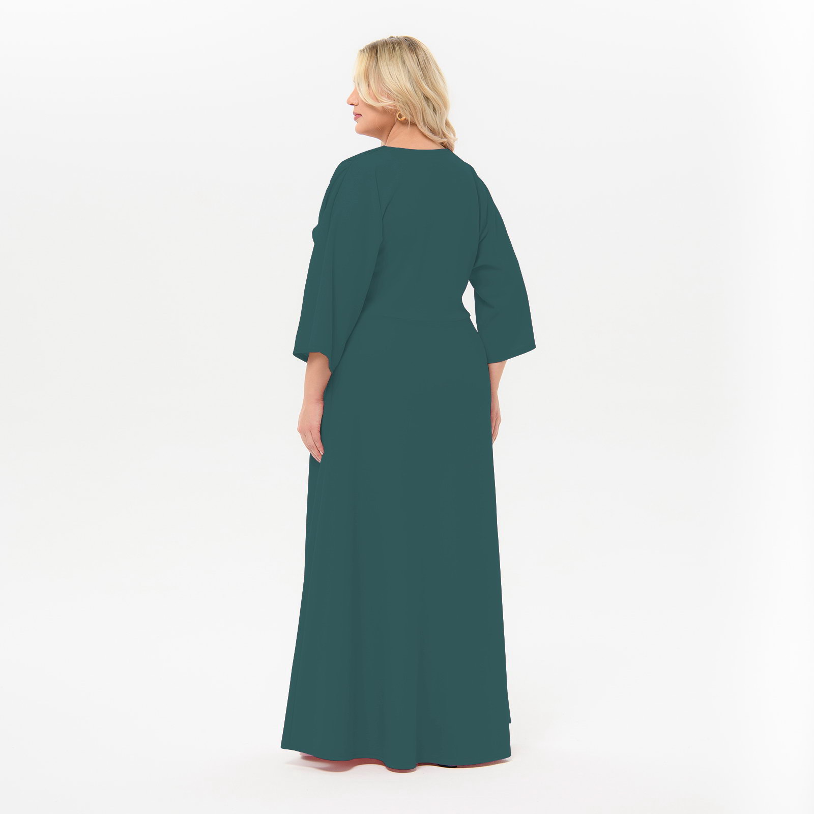 Платье длинное, романтичное, с глубоким V - вырезом, из эластичного плательного крепа, полуприлегающего силуэта. Под линией груди подрез.