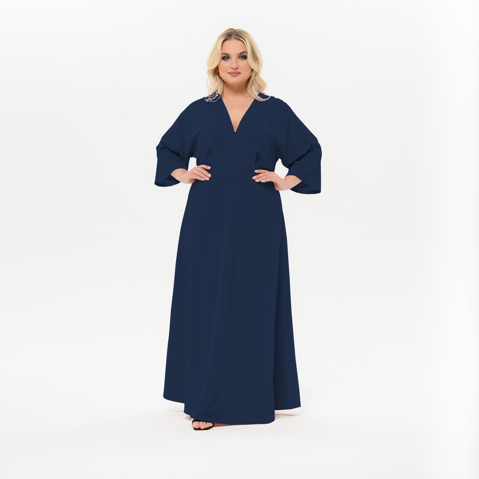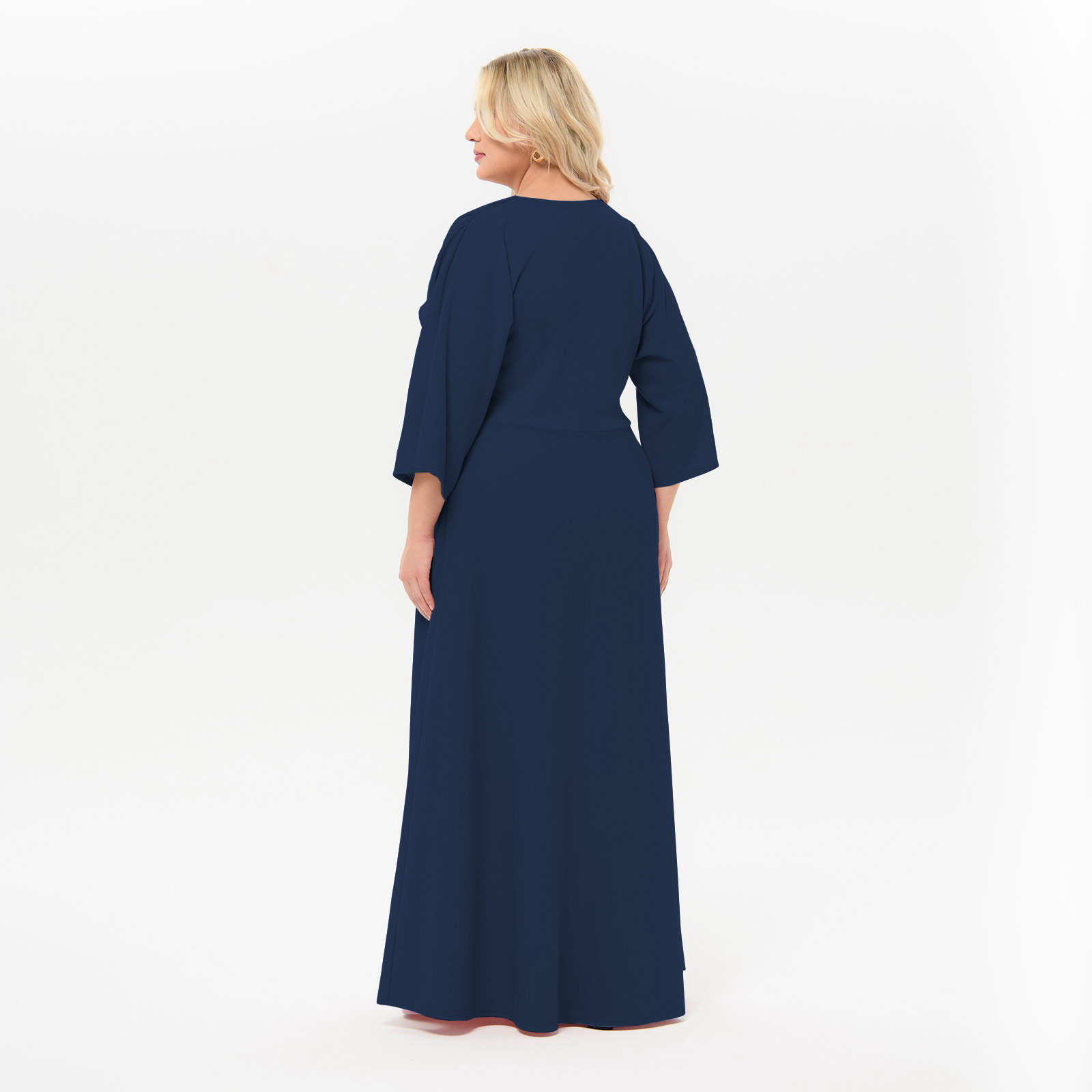 Платье длинное, романтичное, с глубоким V - вырезом, из эластичного плательного крепа, полуприлегающего силуэта. Под линией груди подрез.