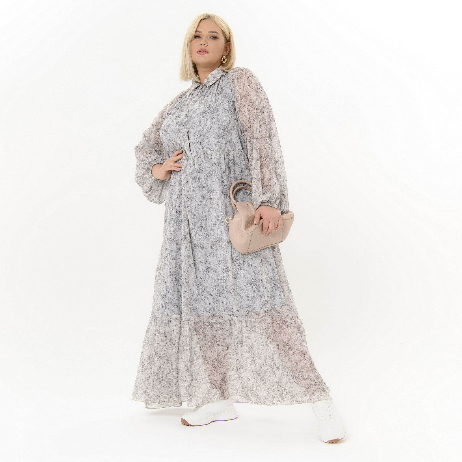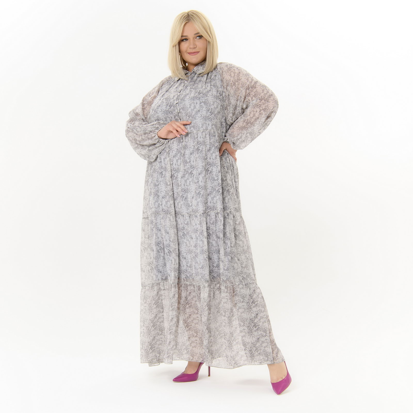 Платье длинное, в стиле 80-х, каскадное, из шифона, принт "нежный"
