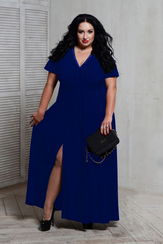 Элегантное длинное вечернее платье из легкого трикотажа черного цвета. V-образный вырез украшен кружевом, спереди широкой юбки разрез.