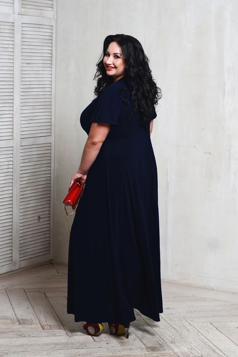 Элегантное длинное вечернее платье из легкого трикотажа темно синего цвета. V-образный вырез украшен кружевом, спереди широкой юбки разрез.