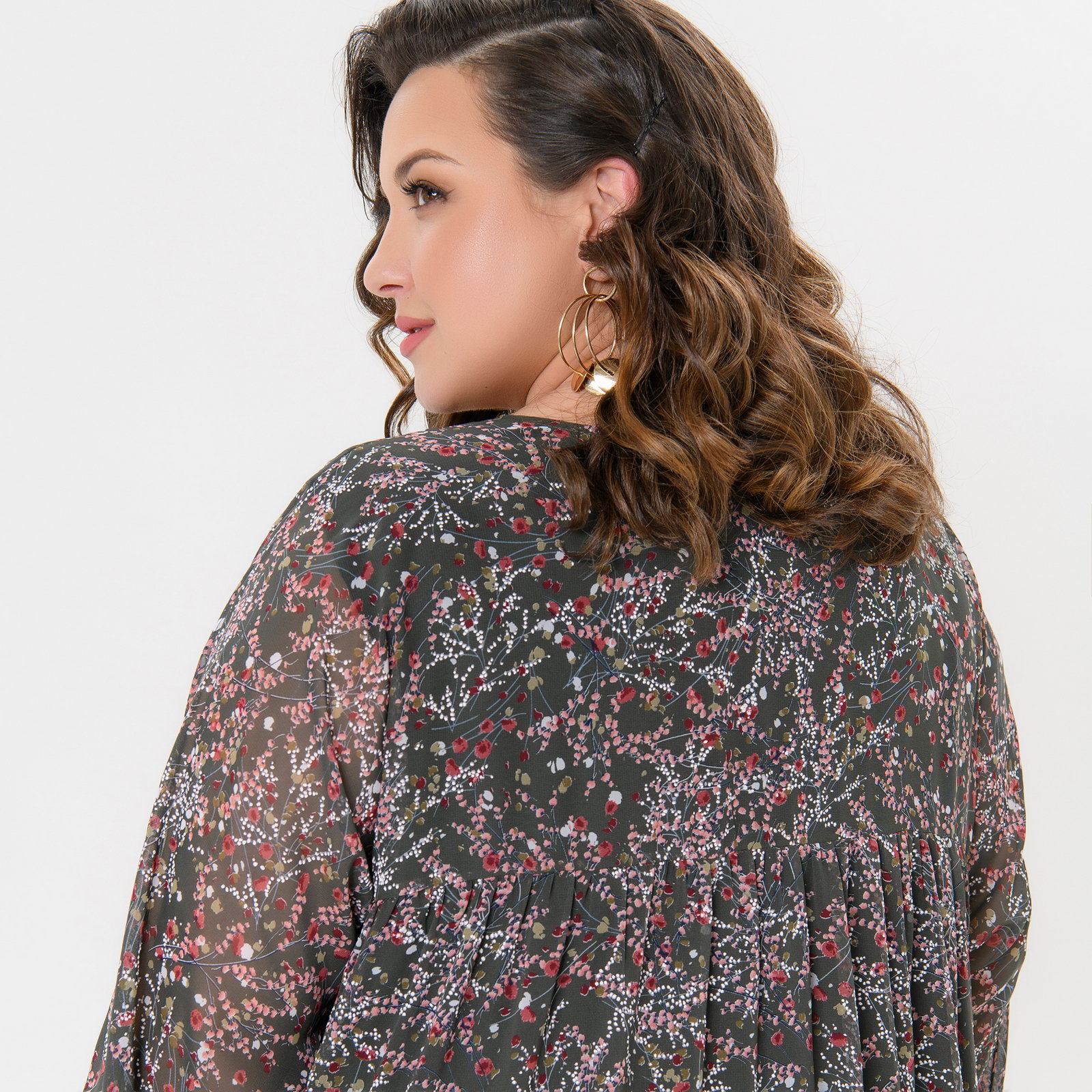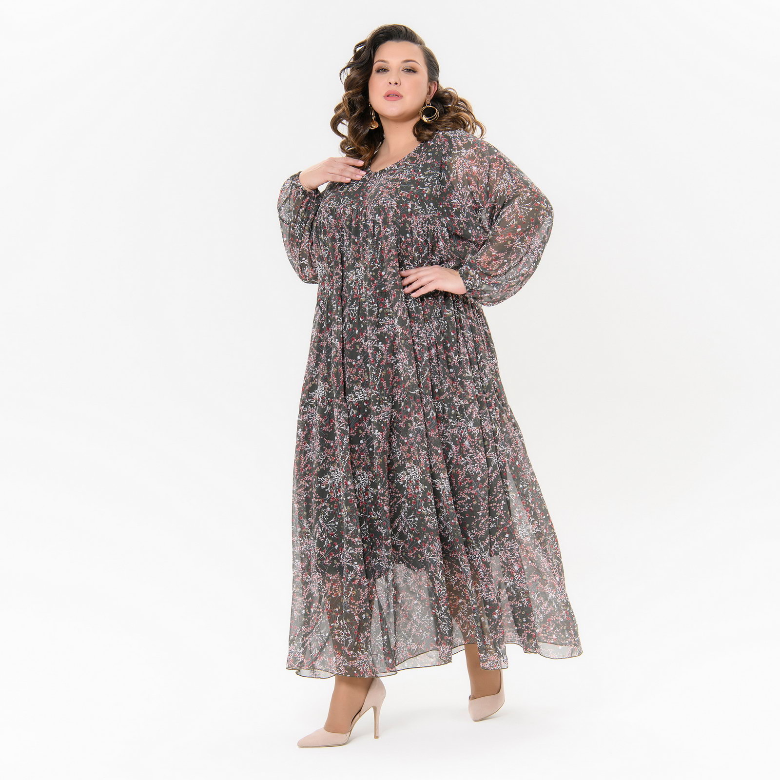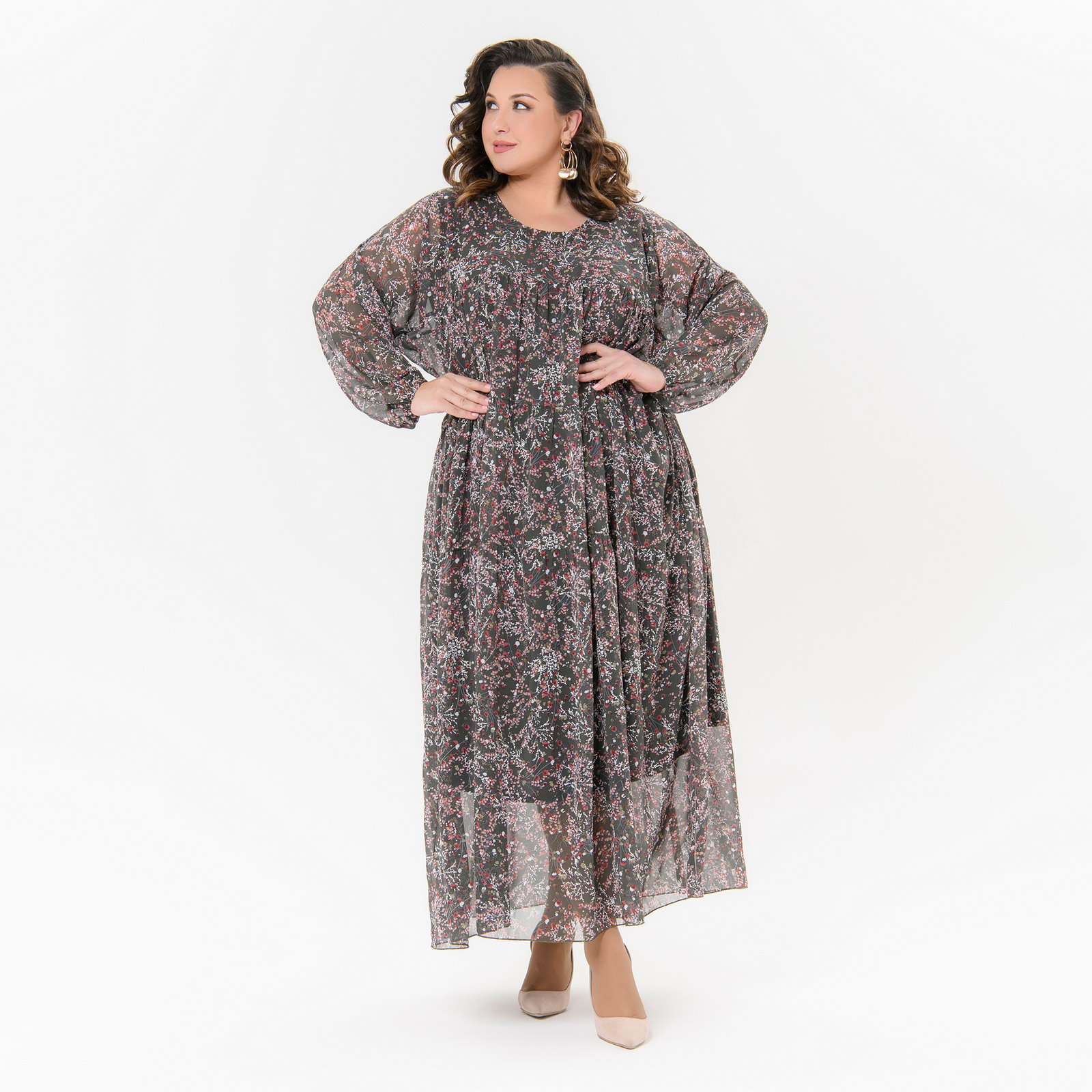 Платье длинное, ярусное, шифон травяной, принт цветочный