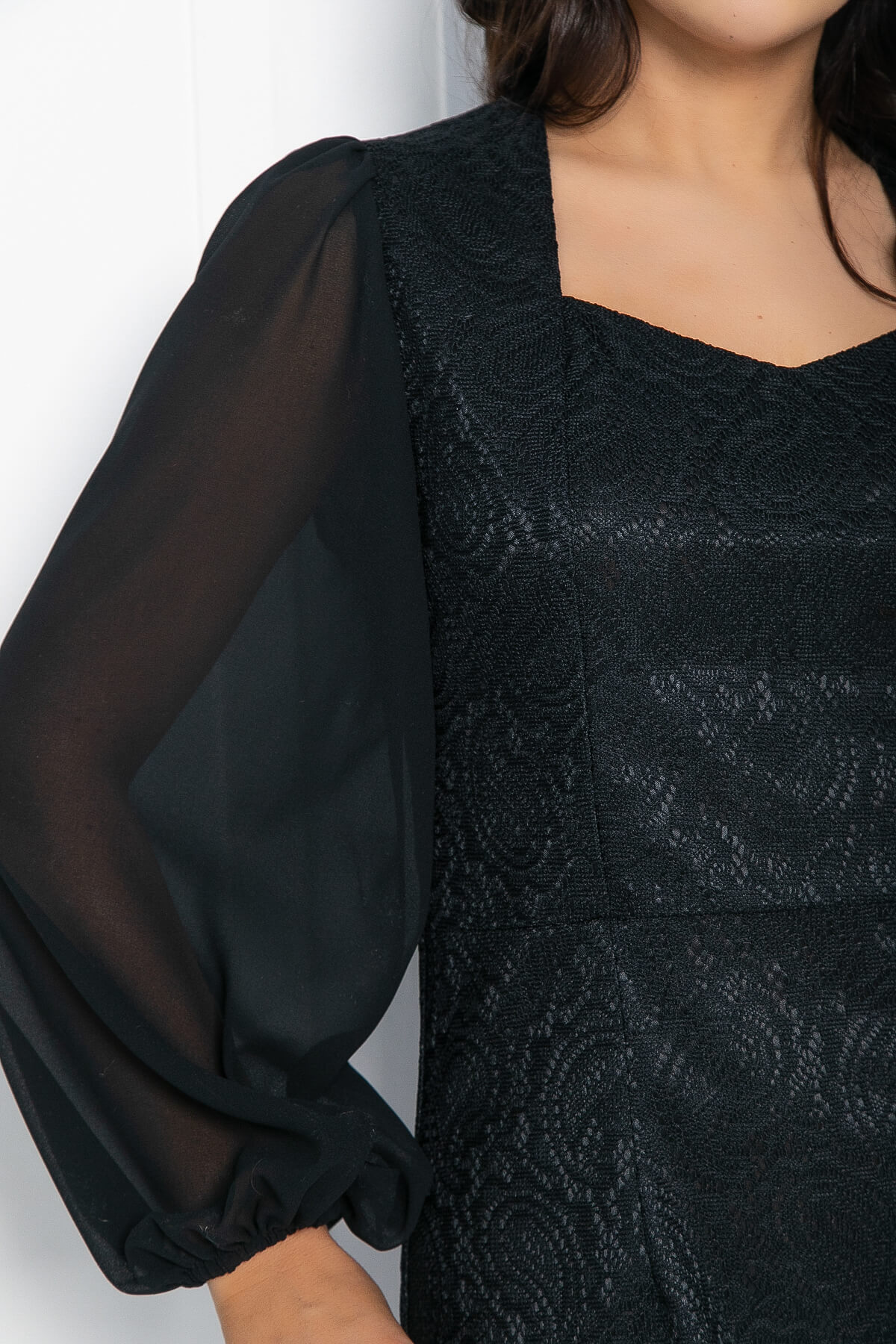 Эффектное платье поможет создать роскошный образ на любое мероприятие, будь то новогодний корпоратив, свадебное торжество или другой праздник. Облегающий силуэт великолепно сидит по фигуре и подчеркивает плавные изгибы женского тела. Модель отличает оригинальный фигурный вырез горловины, который создает красивый и необычный акцент у зоны декольте. Длинные шифоновые широкие рукава собраны на резинку. Для максимально комфортного ношения сзади предусмотрен разрез.