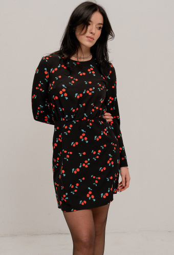 Платье женское, нарядное, приталенного силуэта, длиной до линии колен, из трикотажной бархатной ткани. Перед с талиевыми, нагрудными вытачками. Спинка с застежкой на потайную молнию в среднем шве спинки, талиевыми вытачками. Рукав втачной, одношовный, зауженный книзу, со складками выходящими из линии проймы. Вырез горловины обработан обтачкой.