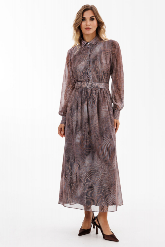 Платье выполнено из шифона с принтом. Платье отрезное по линии талии. Воротник рубашечного типа. Застежка спереди на пуговицы на планке. Рукав втачной, на манжете. Лиф и юбка платья на подкладке из тонкого атласа.  В комплект входит съемный ремень из основной ткани с обтяжной пряжкой.
