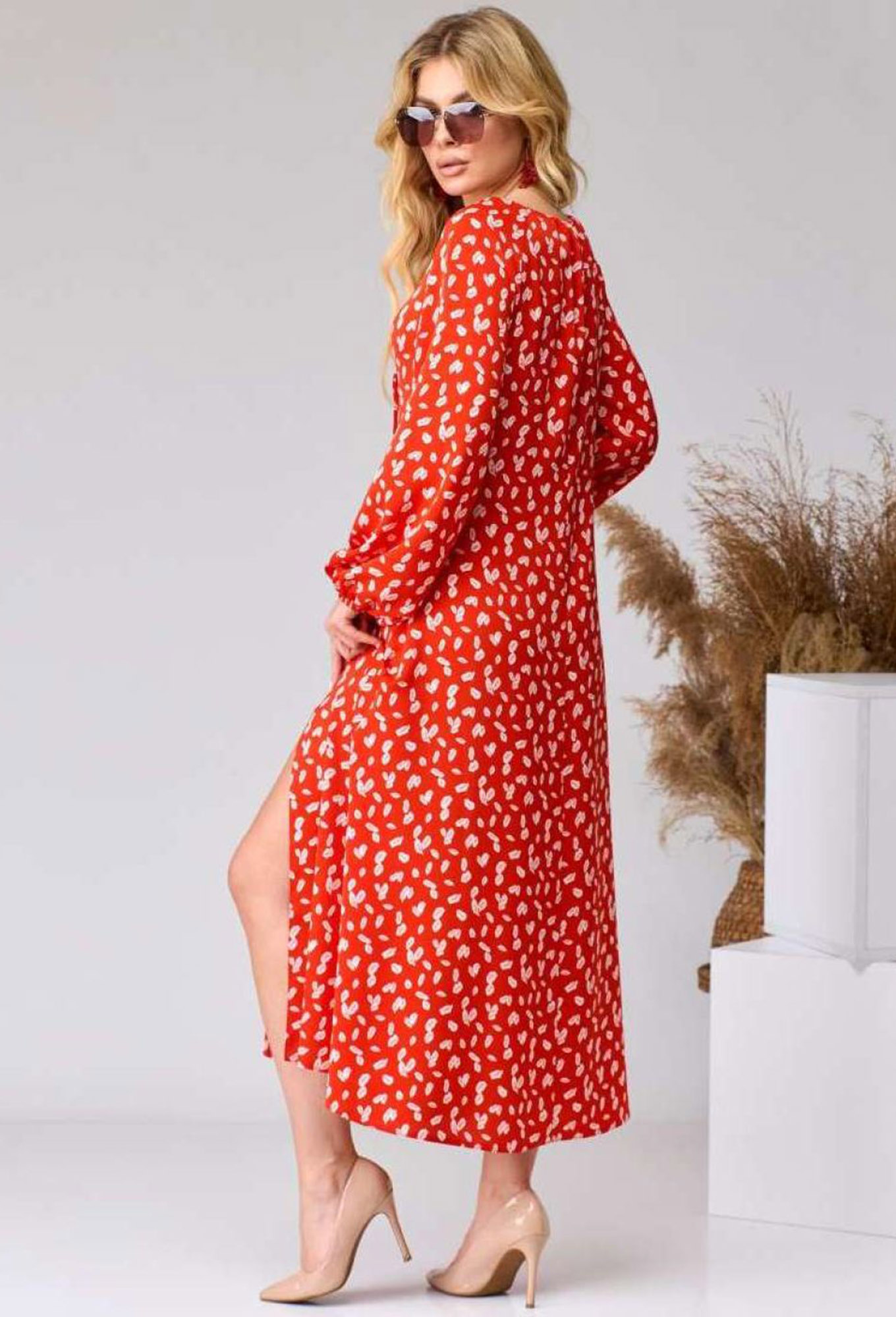 Платье женское нарядно-повседневное полуприлегающего силуэта расширенное к низу, выполнено из цветного крепа. Вырез горловины круглый стянут по всей длине кулисой в цвет платья. По центру декоративный элемент в виде "капли". Рукав "реглан" по низу собран на тонкую резинку. С левой стороны платья обработан разрез.