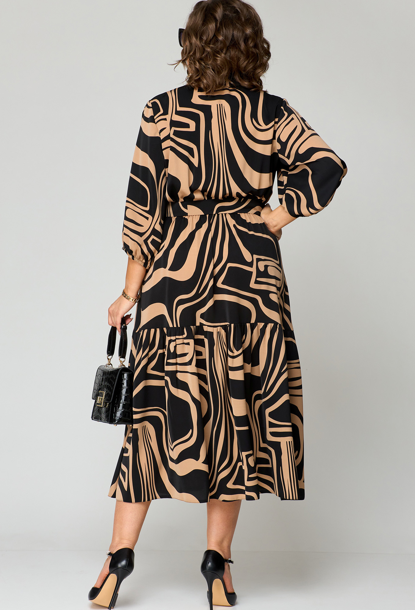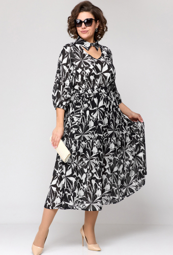 Платье женское нарядно-повседневное отрезное по талии, выполнено из креп-шифона. Вырез горловины фигурный с воротником на стойке переходящей в застежку на одну петлю и отделочную пуговицу. Рукав втачной 7/8 по низу со сборкой на резинку. По центру рукава декоративный разрез открывающий руку. По талии тонкая резинка. Юбка платья с широким воланом собранным на сборку. Декором платья служит съемный пояс.