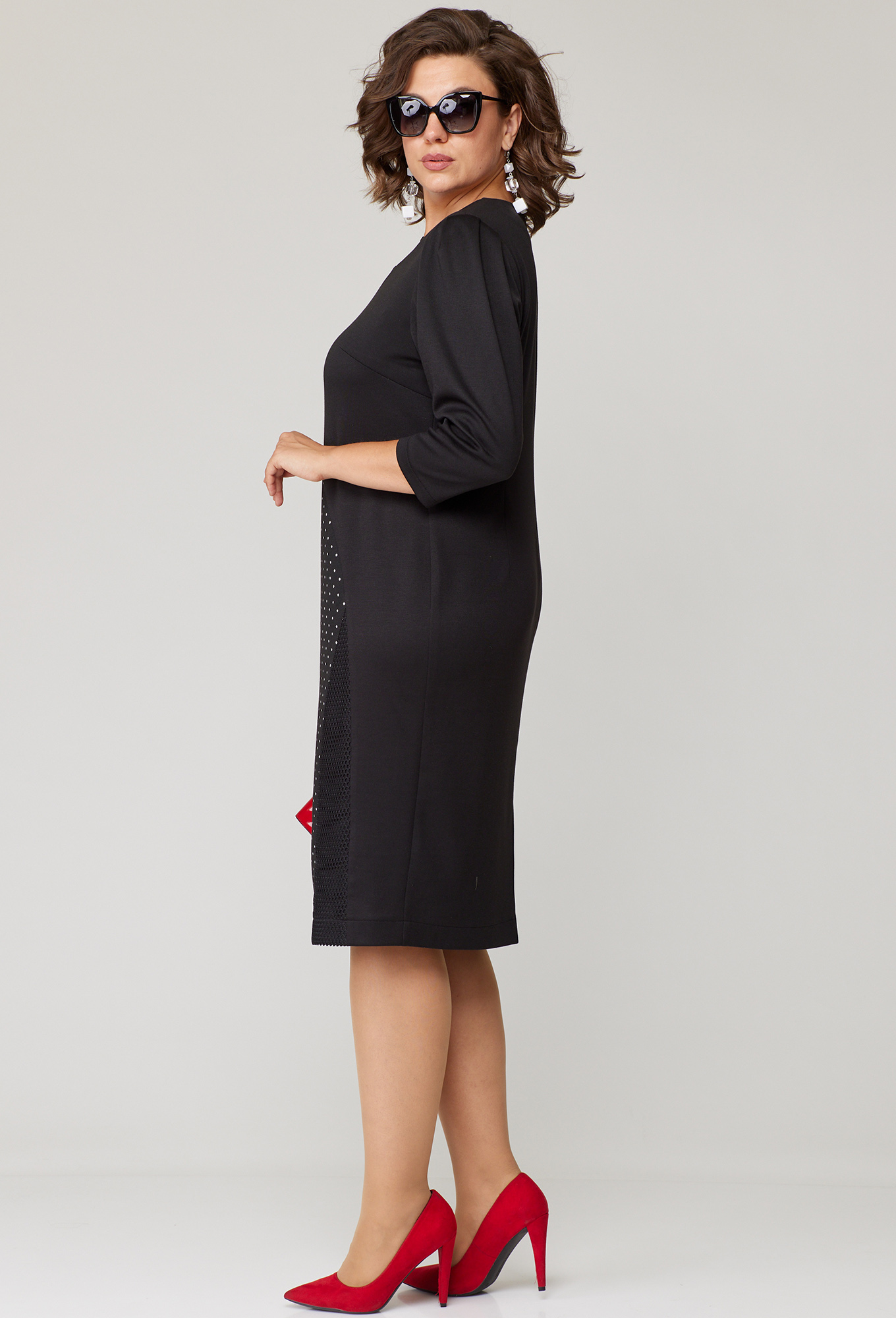 Платье женское повседневное полуприлегающего силуэта выполнено из трикотажного полотна 2х дизайнов и отделки из трикотажной сетки. Вырез горловины круглый, обработан по полочке руликом, по спинке обтачкой. Рукав втачной 3/4 со складками по пройме. По спинке потайная тесьма молния и разрез. Декором платья служат отделочные детали из сетки.