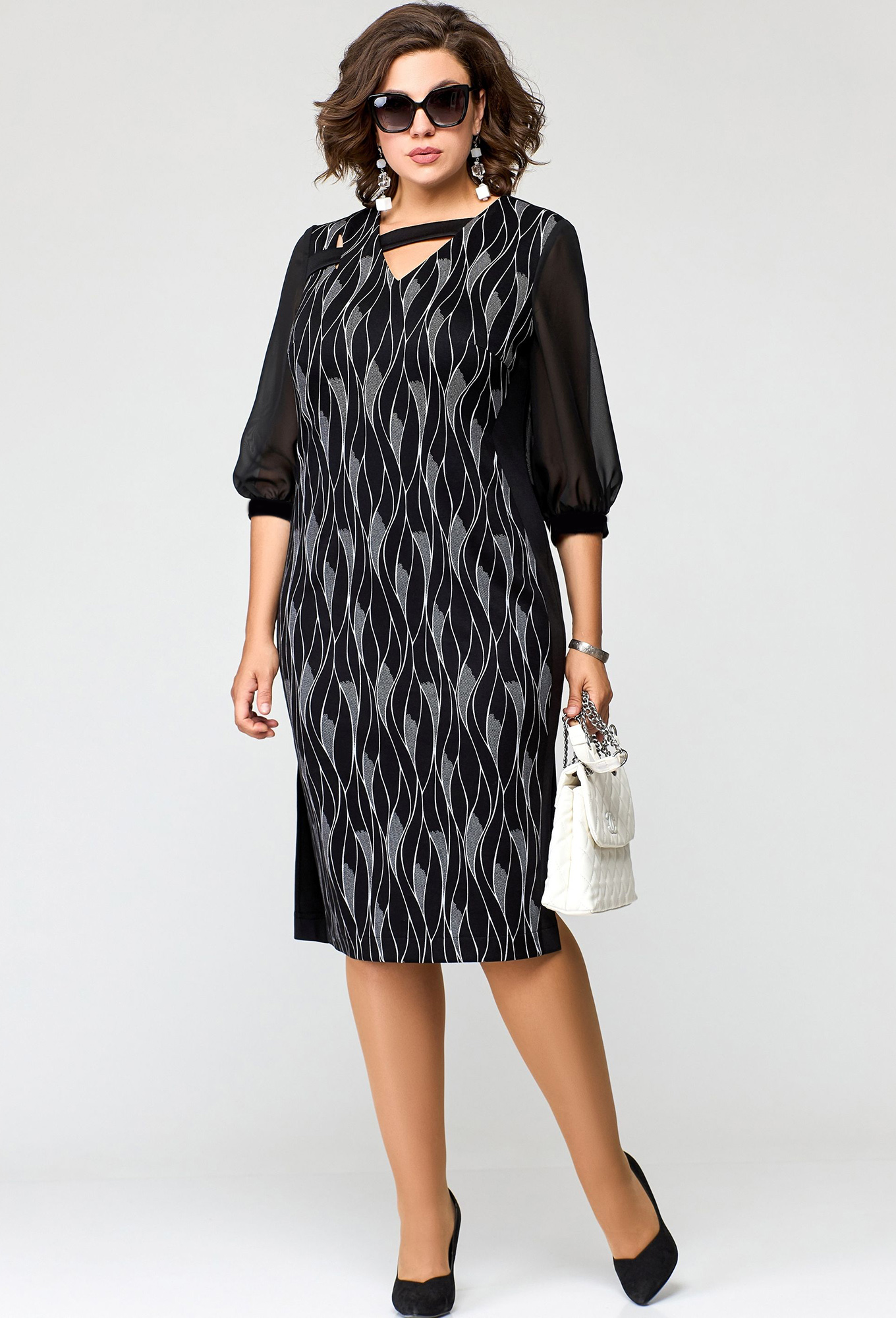 Платье женское нарядно-повседневное прилегающего силуэта зауженное книзу, выполнено из трикотажного полотна двух дизайнов в сочетании с шифоном. Вырез горловины V-образный обработан обтачкой. Рукав втачной 3/4, по низу со сборкой на притачной манжете. По спинке центральный шов и потайная застежка-молния. В боковых швах обработаны разрезы. декором служит отделочный элемент по полочке платья.