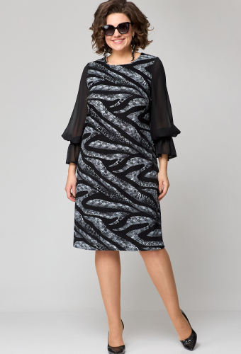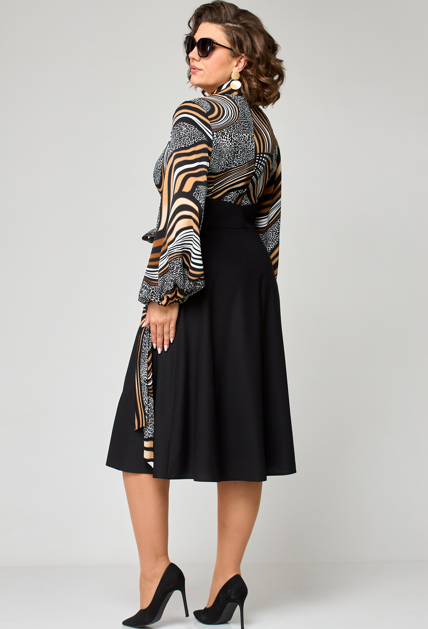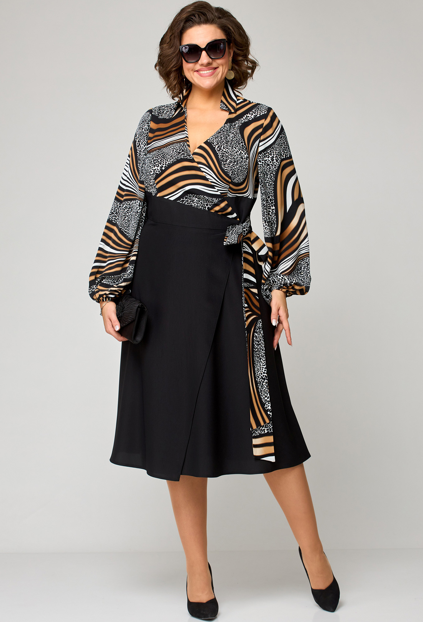 Платье женское нарядно-повседневное на "запах". Выполнено из плательной ткани 2х дизайнов. Вырез горловины V-образный с воротником на стойке. Рукав втачной по низу на резинке. Запах фиксируется на отделочные завязки из ткани. Декором платья служит дизайн лифа платья.