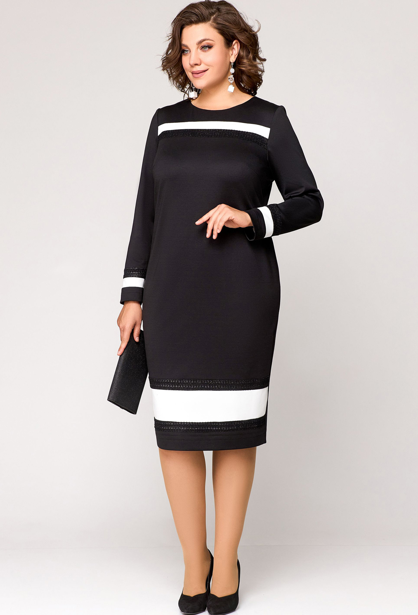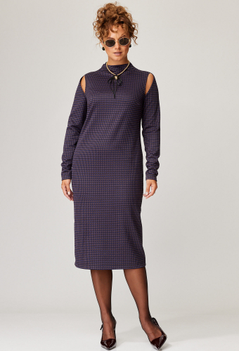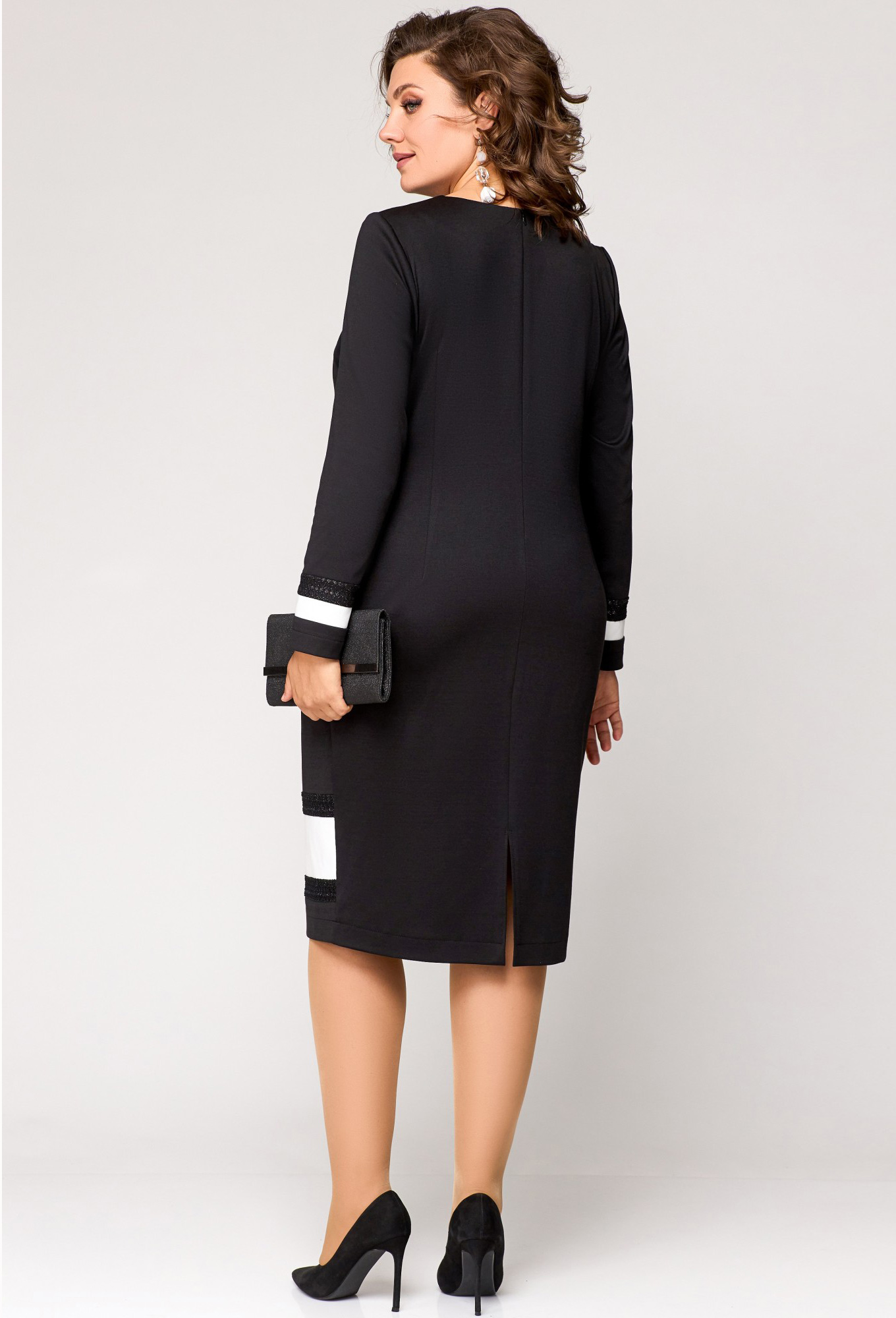 Платье женское повседневное прилегающего силуэта, выполнено из трикотажного полотна в сочетании с отделкой. Вырез горловины круглый на обтачке, рукав втачной. По спинке центральный шов и потайная застежка-молния. В шве обработан небольшой разрез. Декором служат вставки из отделочного трикотажа по переду платья и по низу рукавов.