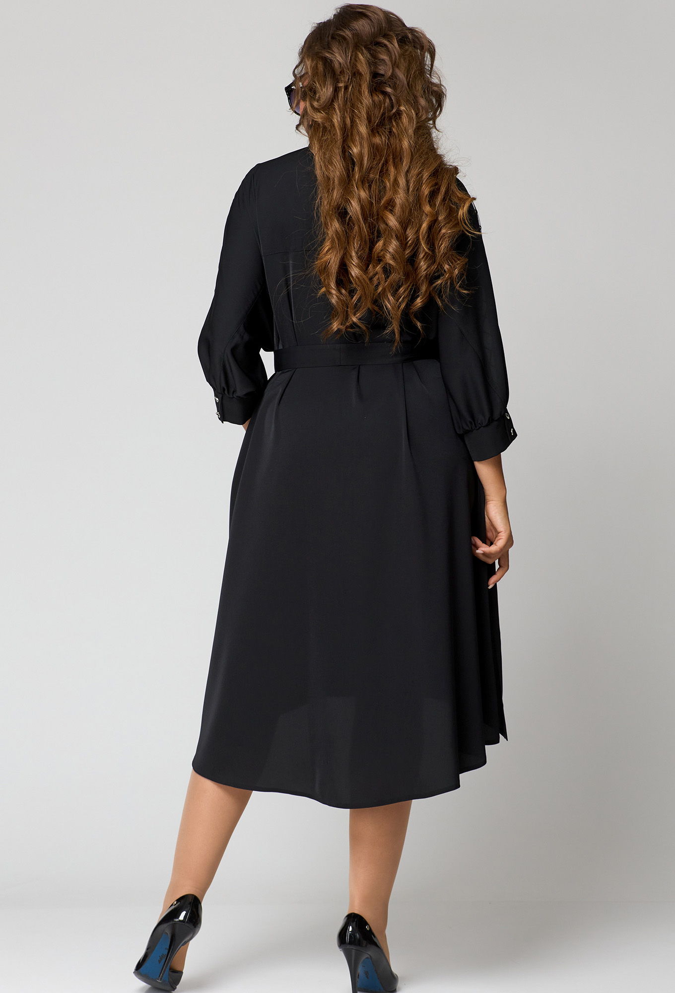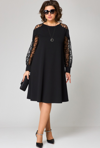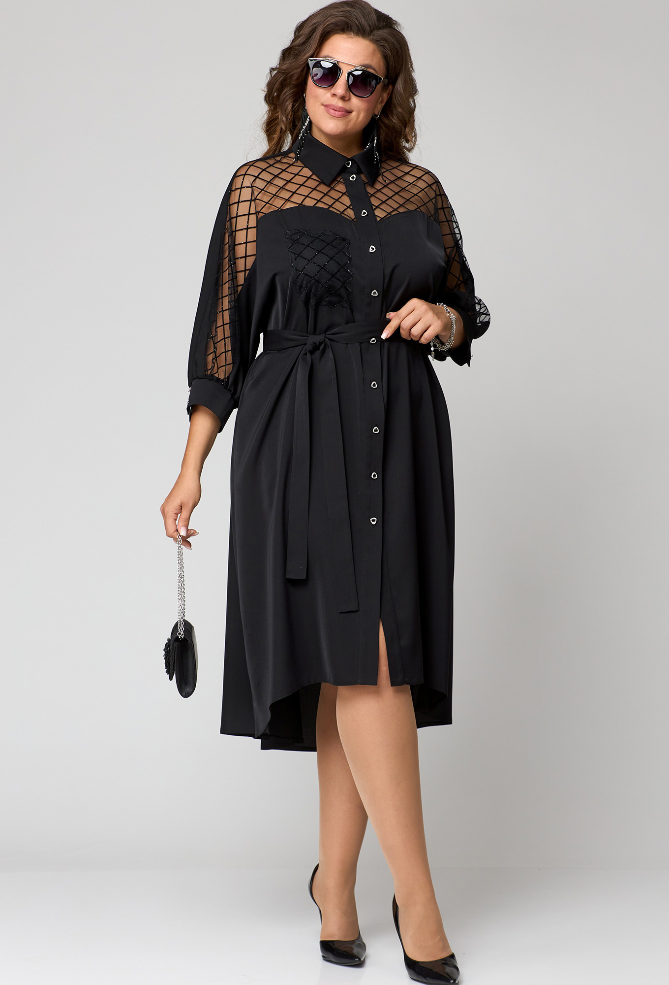 Платье женское нарядное свободного силуэта выполнено из плательной ткани в сочетании с декоративной сеткой с набивным принтом. Вырез горловины рубашечного типа, застежка доверху на обметанные петли и пуговицы. Рукав втачной цельнокроенный с платьем "реглан"7/8, по низу на притачной манжете. Низ платья фигурный. Декором платья служит накладной карман по правой полочке, вставки из сетки и съемный пояс из основной ткани.