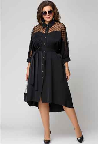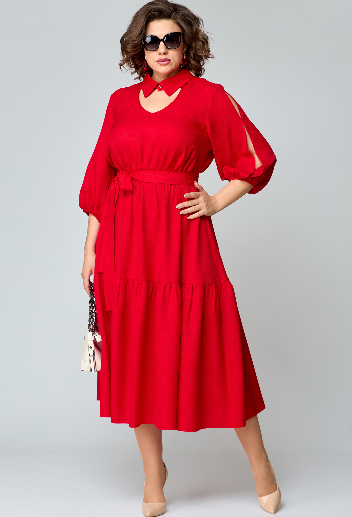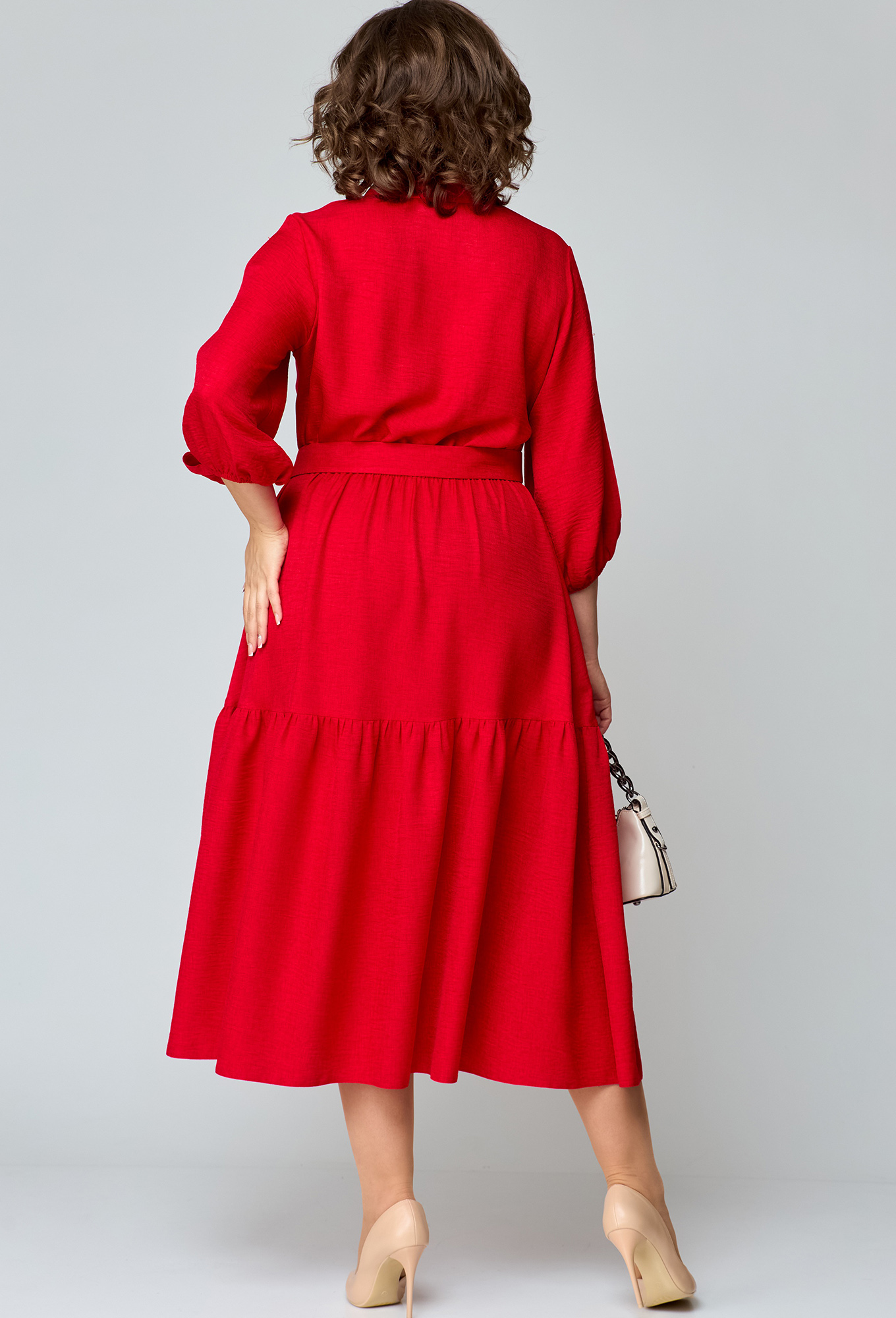 Платье женское нарядно-повседневное отрезное по талии, выполнено из плательной ткани. Вырез горловины фигурный с воротником на стойке переходящей в застежку на одну петлю и отделочную пуговицу. Рукав втачной 7/8 по низу со сборкой на резинку. По центру рукава декоративный разрез открывающий руку. По талии тонкая резинка. Юбка платья с широким воланом собранный на сборку. Декором платья служит съемный пояс.