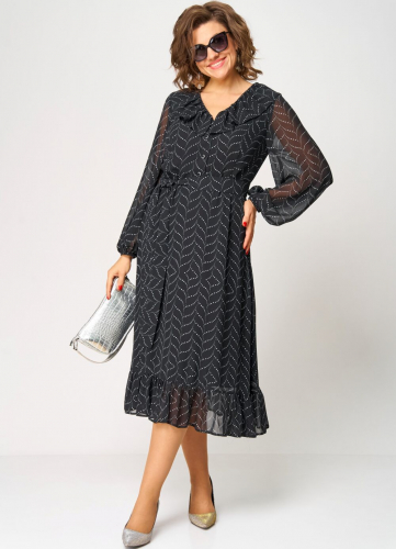 Платье женское нарядно-повседневное полуприлегающего силуэта расширенное к низу на трикогтажной подкладке. Выполнено из креп-шифон с анималистичным принтом. Платье отрезное по талии, по низу юбки волан со сборкой. Вырез горловины V-образный с притачной рюшей, обработан обтачкой. Рукав втачной по низу на резинке. Декором платья служит съемный пояс из основной ткани.