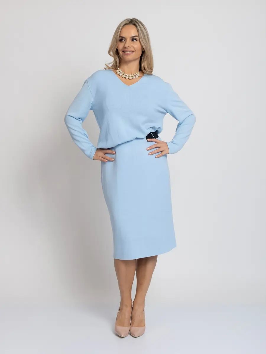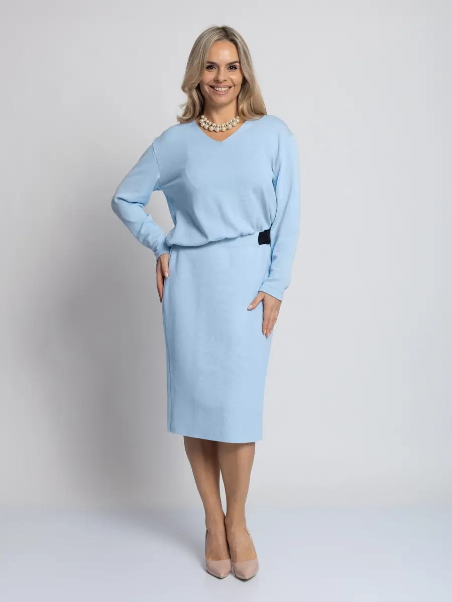 Вязаное элегантное женское платье, отрезное по талии . Спущенное плечо, рукава длинные. V-образный вырез. По талии проложен пояс с пряжкой, драпировка с напуском по правому боку. голубой