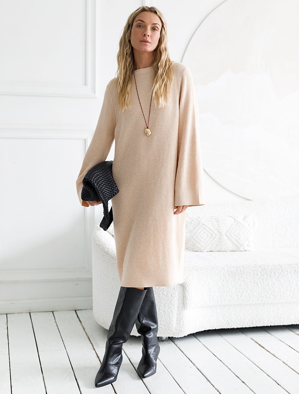 Платье прямого силуэта фактурной вязки выполнено из хлопка с добавлением кашемира.
