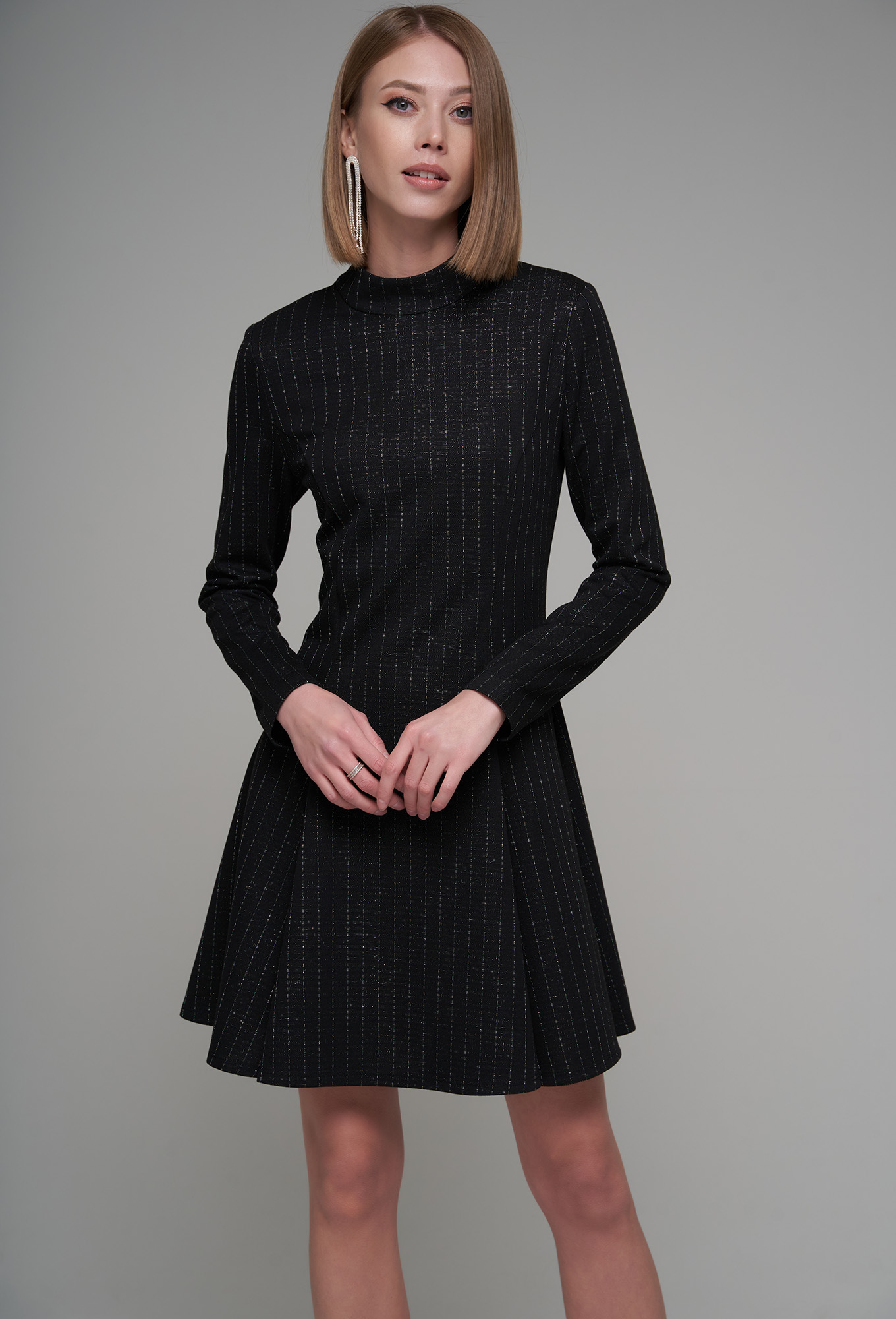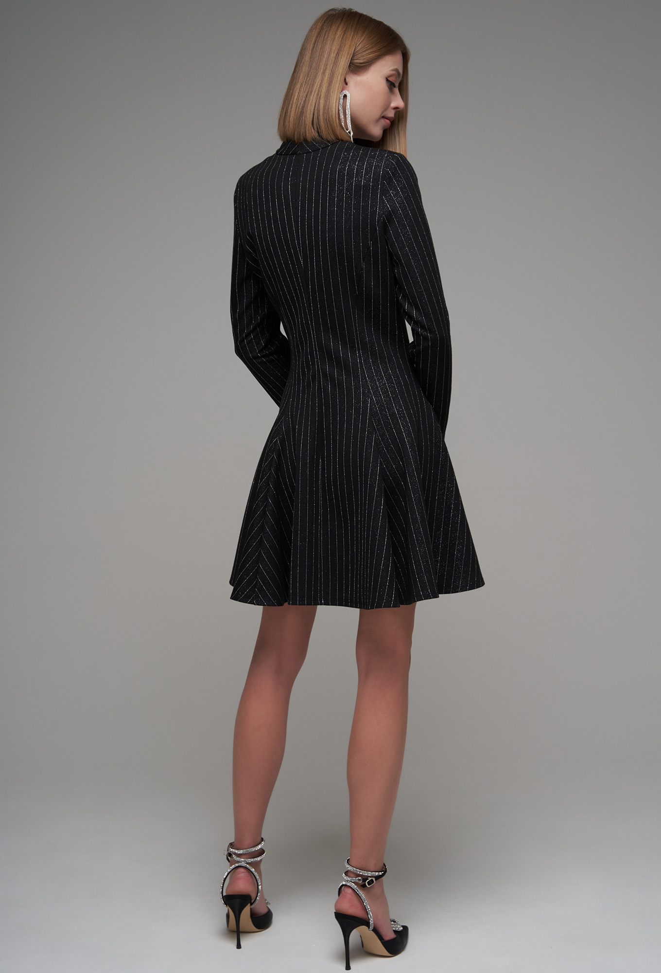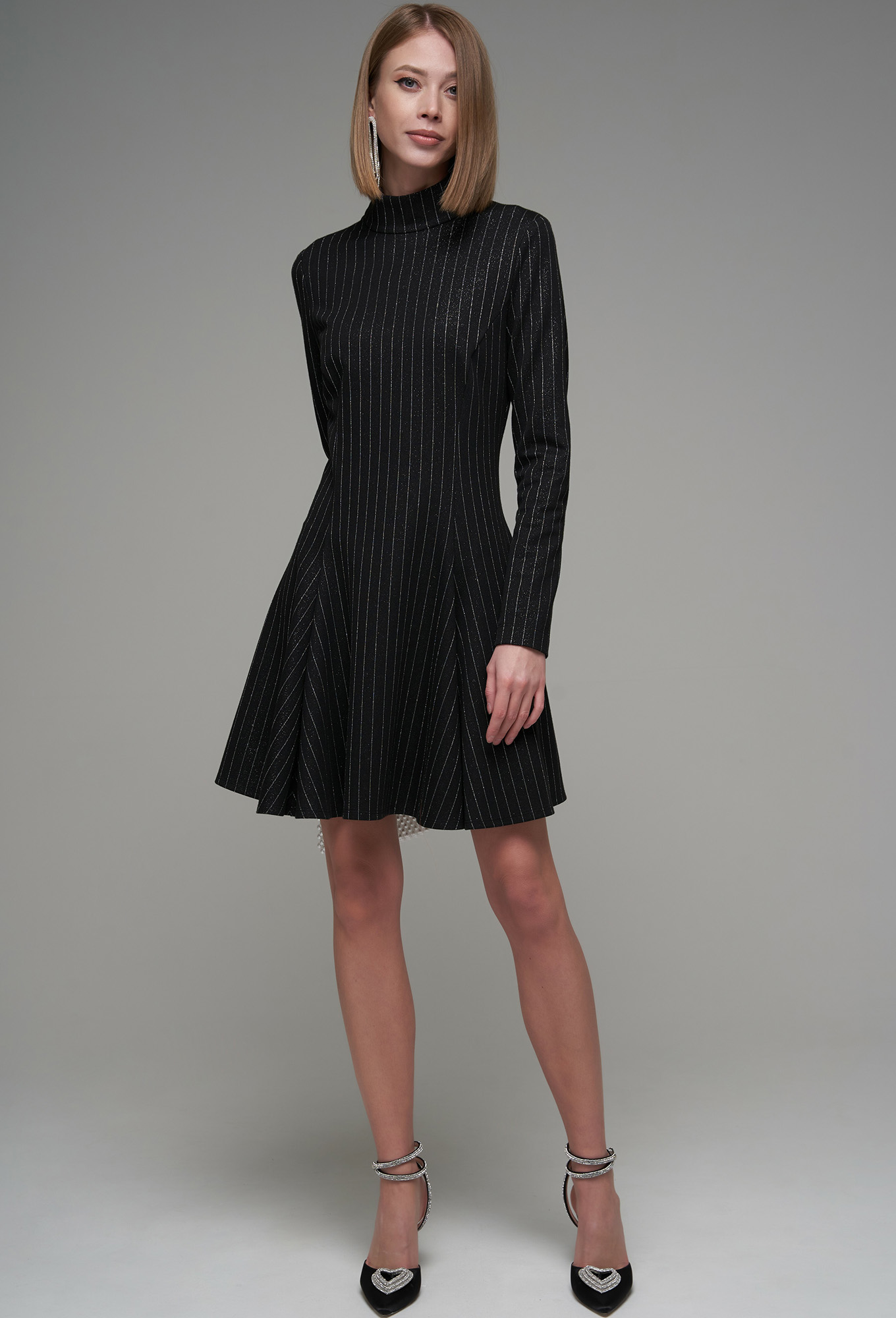 Платье полуприлегающего силуэта, расклешенное к низу. Перед и спинка с рельефами от проймы. В среднем шве спинки обработана потайная молния. Рукав втачной одношовный. Воротник стойка. Фурнитура может быть изменена, сохраняя целостность художественного замысла. Длина спинки по среднему шву-85см, длина рукава-61см.