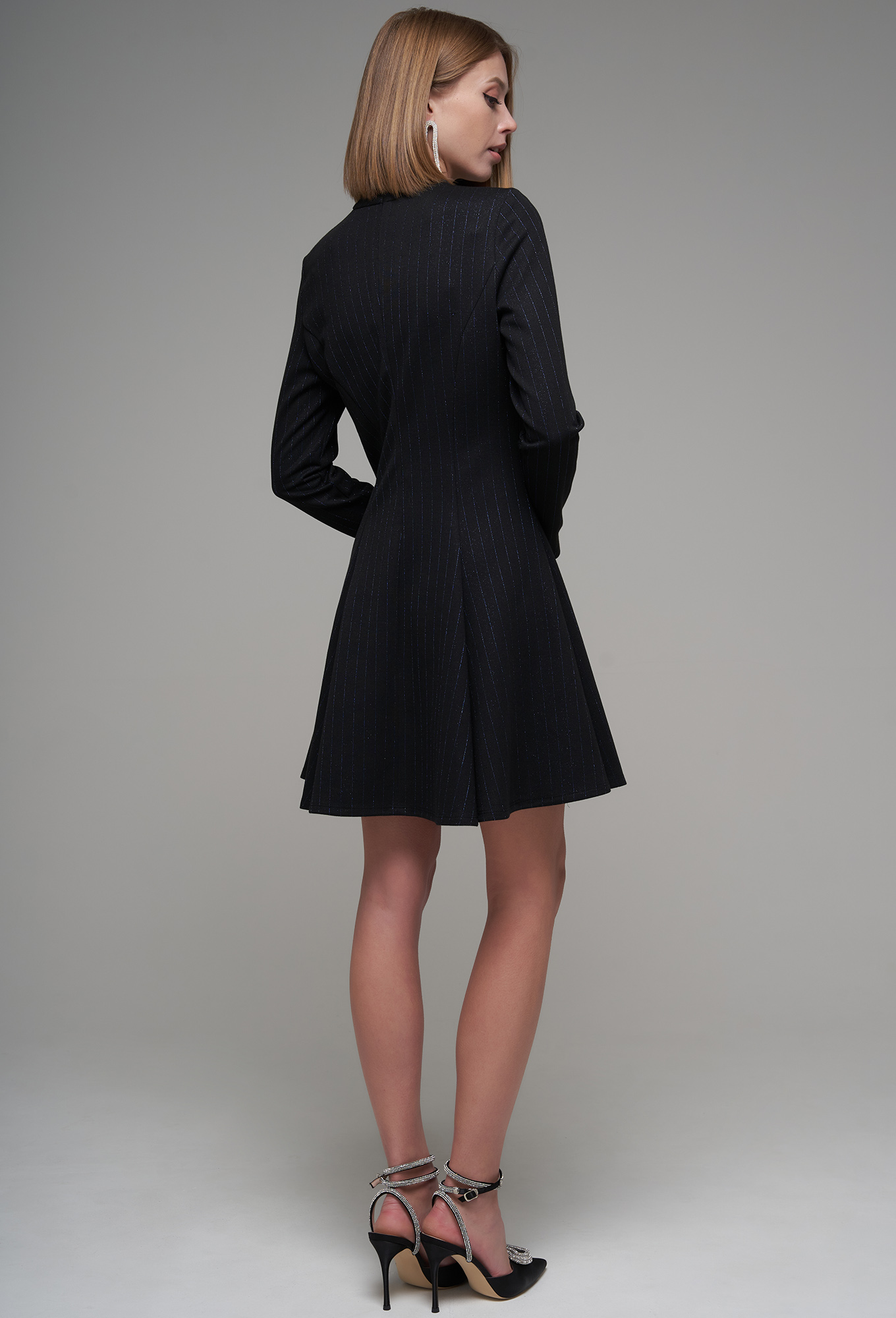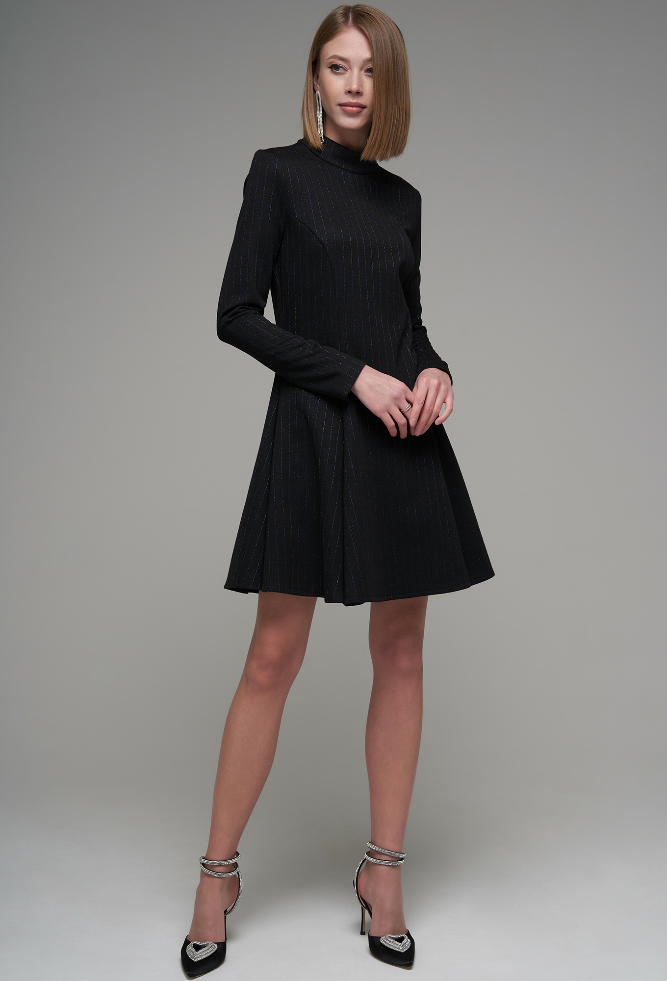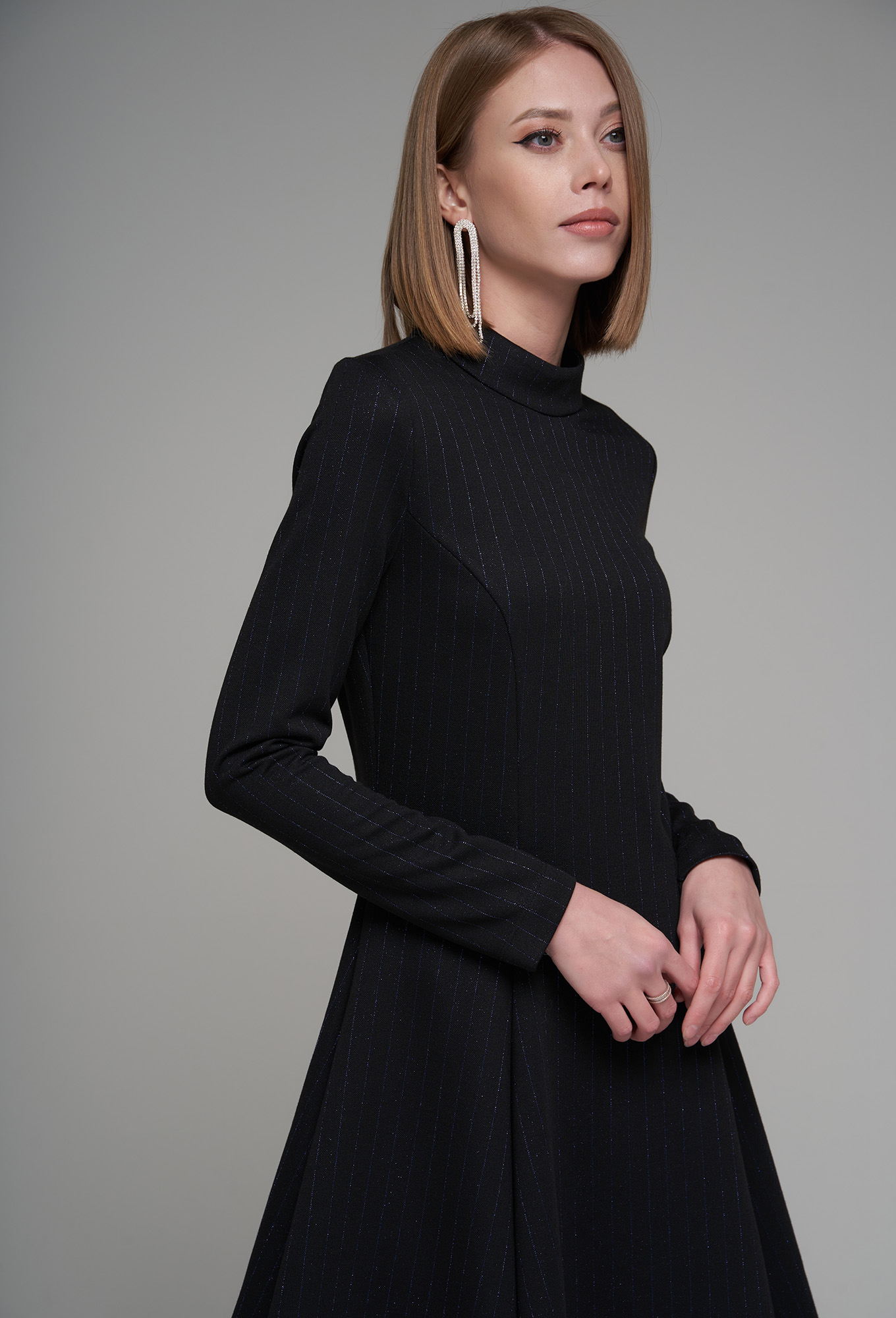 Платье полуприлегающего силуэта, расклешенное к низу. Перед и спинка с рельефами от проймы. В среднем шве спинки обработана потайная молния. Рукав втачной одношовный. Воротник стойка. Фурнитура может быть изменена, сохраняя целостность художественного замысла. Длина спинки по среднему шву-85см, длина рукава-61см.