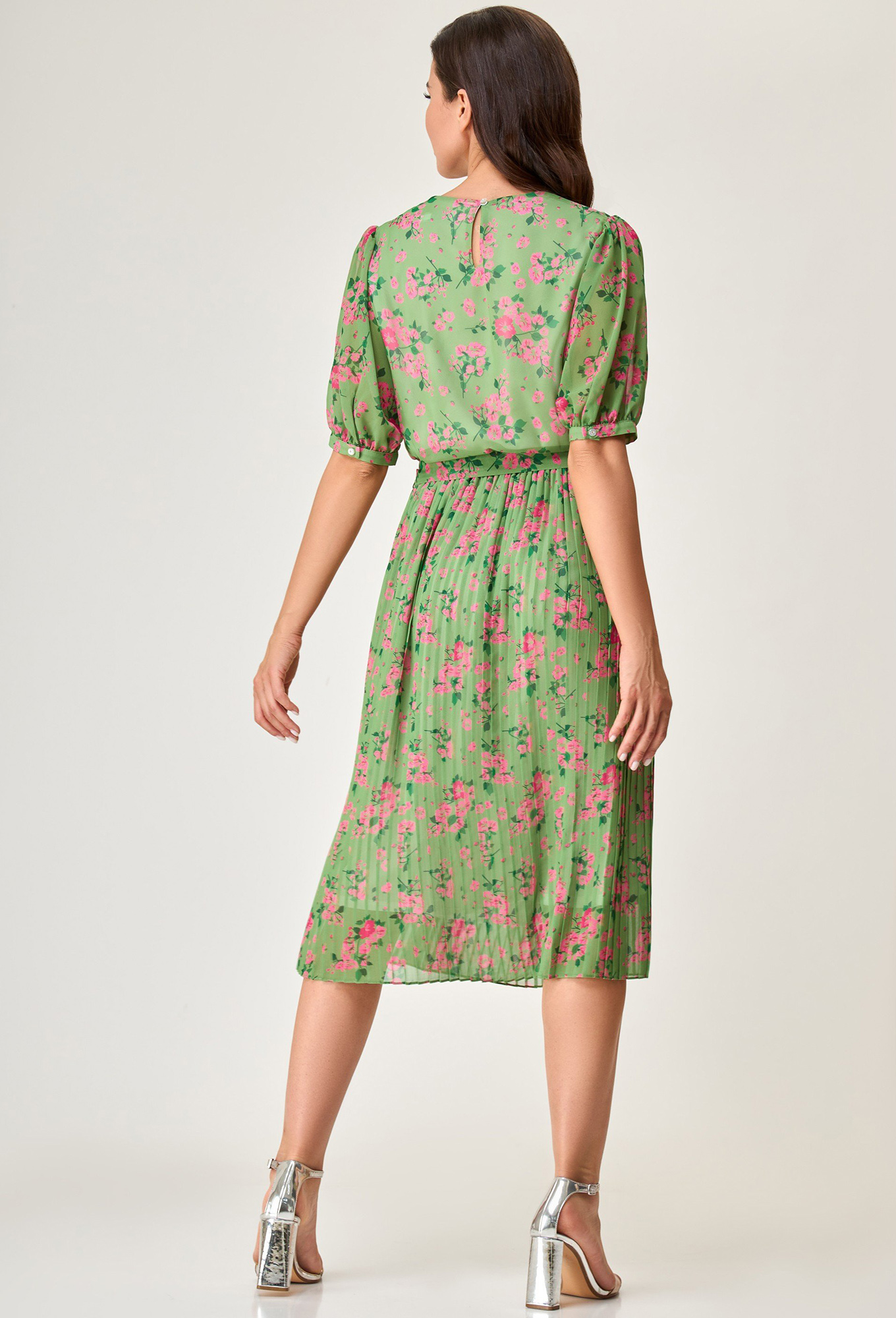 Платье прямого силуэта, отрезное по линии талии и приталенное с помощью резиночки, с юбкой плиссе. Перед с нагрудной вытачкой. В боковых швах шлевки. Горловина круглая, по спинке застежка капелька на одну петлю-пуговку. Рукав втачной со сборкой по окату и по низу с притачной манжетой с застежкой на одну петлю- пуговку. Платье на подкладке. Платье дополнено поясом из основной ткани.